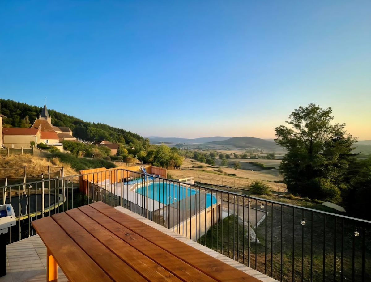 Gite með sundlaug og norrænu baði. Þetta gite var hlaða sem var breytt að fullu í gite. Frá eldhúsinu og borðstofunni er útsýni yfir Arroux og Loire-dalinn. Við sjóndeildarhringinn sjáum við Massif Central. Bústaðurinn er á 4 hektara náttúruperlu (Maison Le Garochet). Þú hefur aðgang að sundlauginni og norræna baðinu (til að deila með öðrum gite okkar yfir sumartímann). Á svæðinu hafa mörg slökunarsvæði verið búin til.