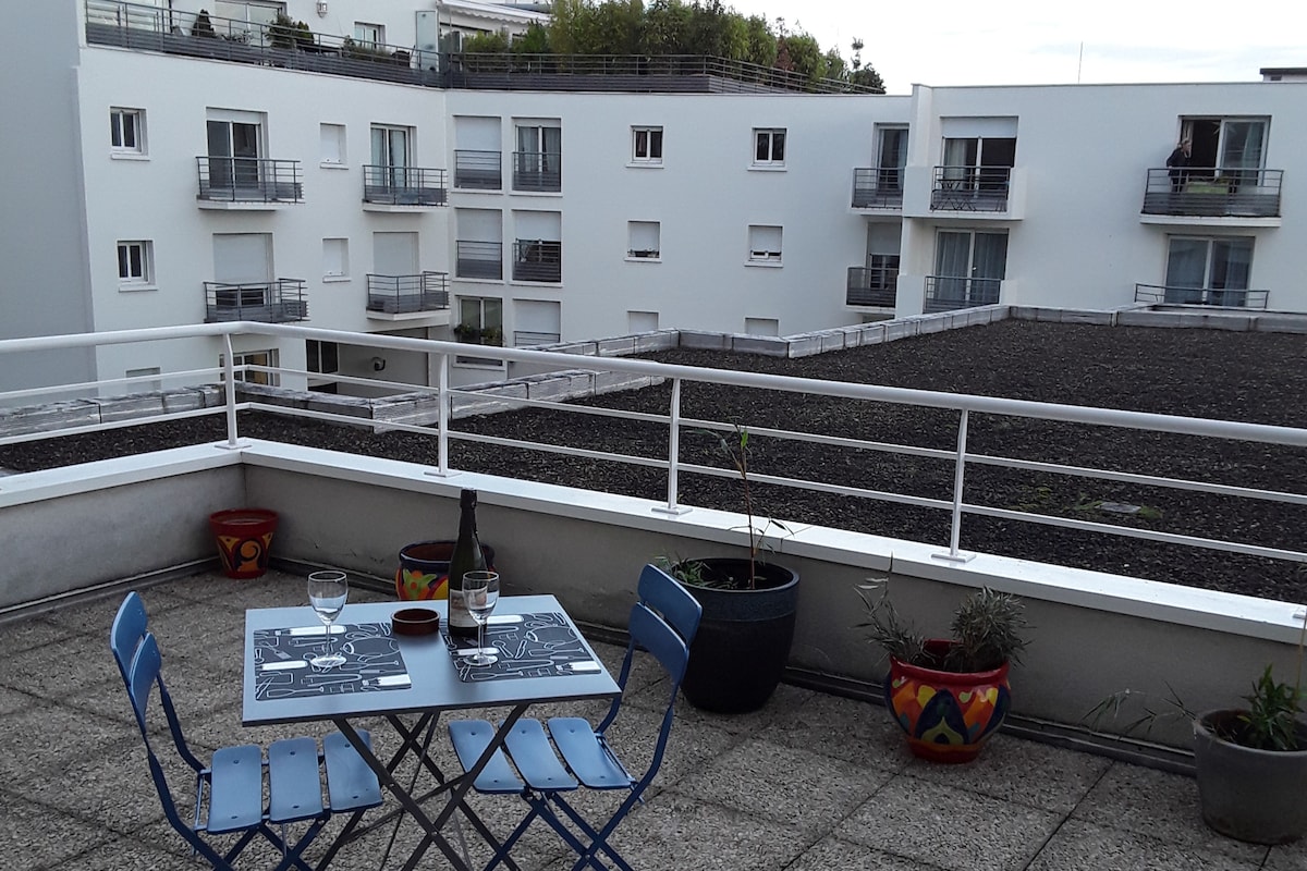 logement 45 M² comprenant une chambre ,cuisine équipée, une pièce de vie avec canapé lit,salle de douche avec WC. La capacité d’accueil est de 4 couchages. Le logement refait à neuf est situé au sein d’un manoir du 16 et 17 ° siècle, dans un lotissement privé, au calme, avec vue sur un parc boisé. Quartier des 2 LIONS de TOURS, vous serez à 15mn en tramway du centre de Tours (arrêt du tramway à 300 mètres). Espace extérieur avec table et chaises pour profiter de la douceur tourangelle