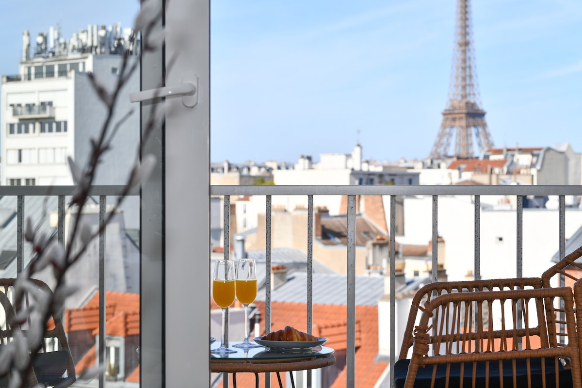 Top-floor haven with a large, sunlit balcony and an unobstructed Eiffel Tower view. Newly refurbished by a designer, it features an Italian shower, a comfy queen-size bed, and a quality sofa bed for groups of 3–4. Bright living/dining area, fast broadband and Netflix. Secure building in a vibrant neighborhood packed with cafés, restaurants, and shops. Metro station just 2 minutes’ walk. Perfect for couples, friends, or business stays.