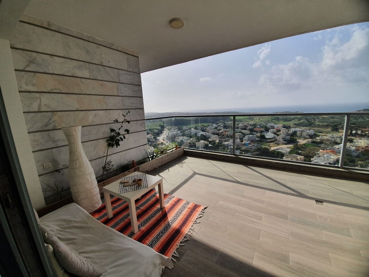Fullbúin íbúð með ótrúlegu sjávarútsýni af svölunum og úr svefnherberginu. Íbúðin er nálægt sjávarströndinni með Miðjarðarhafsstemningu. Íbúðin er staðsett í grænu, afslappandi og öruggu þorpi í Neot Golf Caesarea, þar á meðal tveimur sundlaugum, tennisvelli, líkamsræktarstöð, skvassvelli, körfubolta, minigolfi og tveimur mögnuðum stórum leikvöllum fyrir börn. Íbúðin er mjög nálægt stórmarkaði og „C-miðstöðinni“. Golfklúbburinn er í 10 mín göngufjarlægð frá íbúðinni. Gamla höfnin í Caesarea er í 3 mín akstursfjarlægð