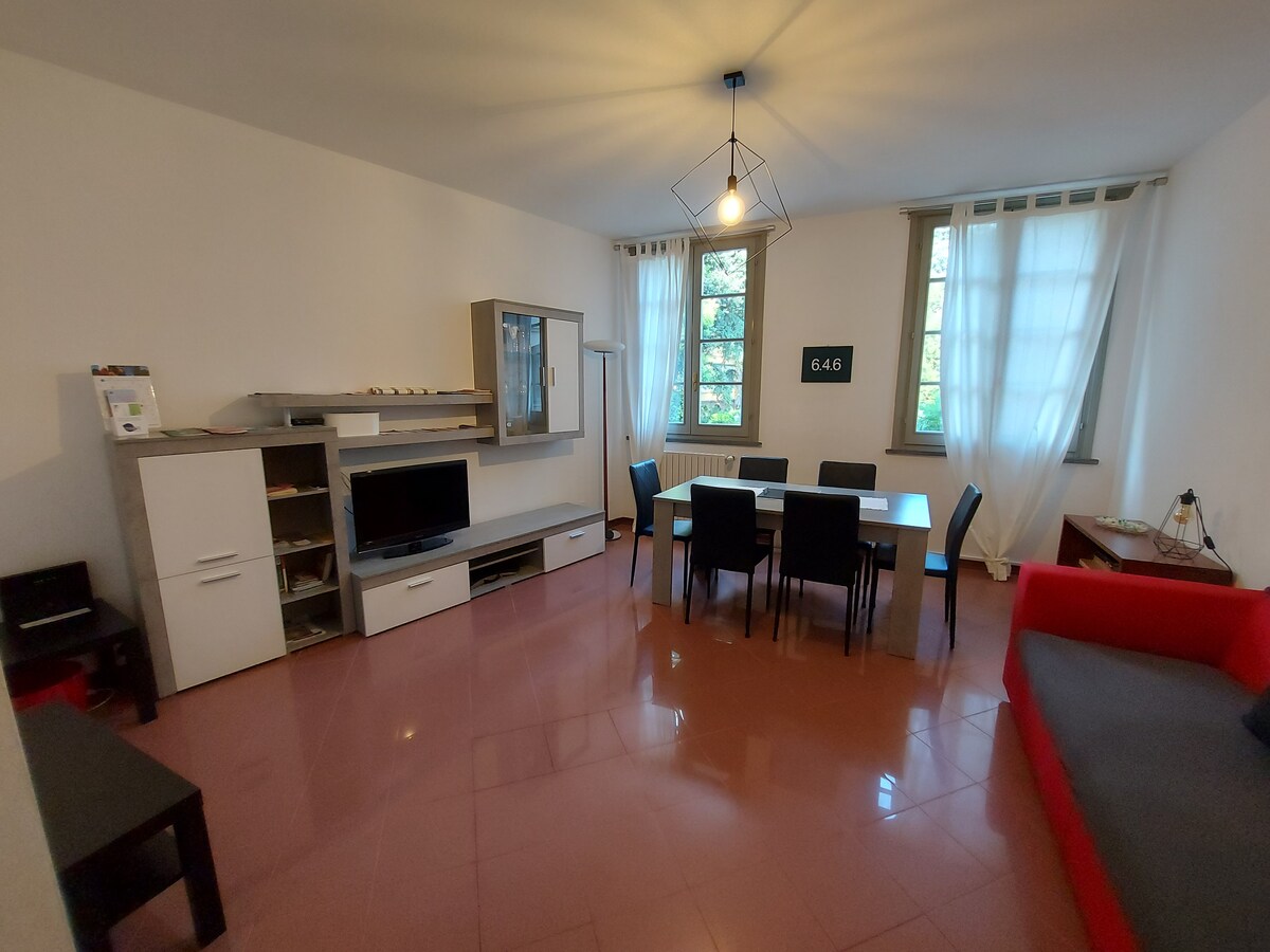 122 m2 íbúð í sögulegum miðbæ Reggio Emilia gerði upp árið 2020. Íbúðin er staðsett á fyrstu hæð (með lyftu) og samanstendur af íbúðarhæfu eldhúsi, þvottahúsi, borðstofu, stofu, baðherbergi, hjónarúmi (king size rúmi) og hjónaherbergi (með tveimur 1/2 fermetra rúmum). Eftir nokkurra mínútna göngufjarlægð er hægt að komast á áhugaverða menningarstaði borgarinnar og fjölmargra staða og veitingastaða, samkomustaðar og miðbæjar Reggiana.
