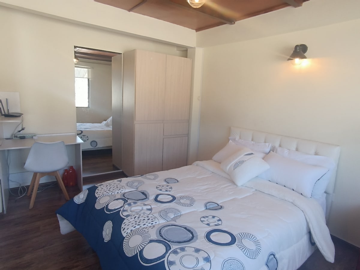 Kynnstu þægindum og öryggi þessarar notalegu íbúðar í líflegu norðurhluta Quito. Þessi eign er tilvalin fyrir þá sem eru að leita sér að notalegri gistiaðstöðu. Íbúðin er á sjálfstæðri þriðju hæð. Þegar þú kemur inn tekur þú eftir þægilegu andrúmslofti og skreytingum í smáatriðum. Eldhúsið, stofan og borðstofan í amerískum stíl eru búin öllu sem þú þarft. Herbergið er með þægilegt og rúmgott rúm. Baðherbergið er nútímalegt án þess að missa retró-blúsinn.