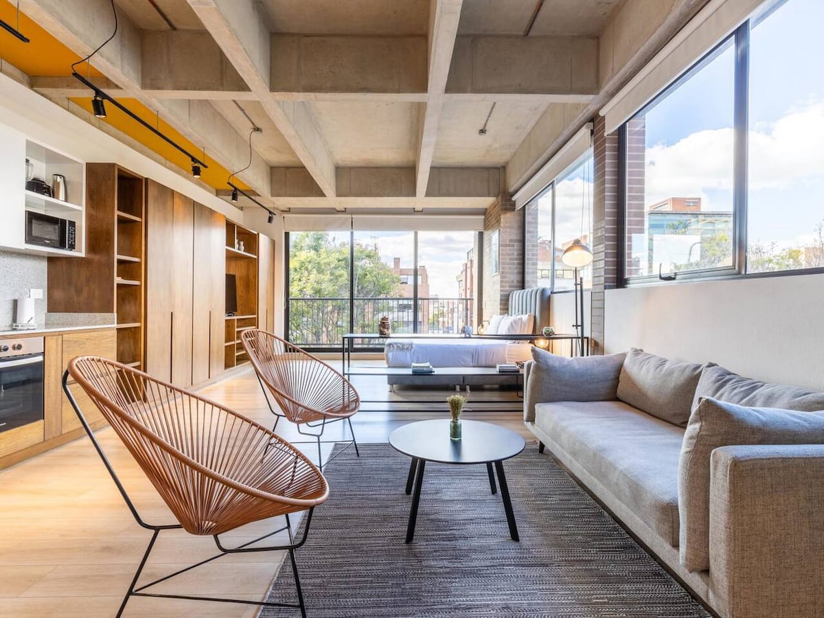 Nútímalegt og sólríkt loftíbúð sem er staðsett í einu af fágætustu hverfum Bogotá, aðeins nokkrum skrefum frá Parque de la 93. Opin hönnunin er með hátt, sýnilegt steypuþak og stóra glugga með útsýni yfir borgina og fjöllin. Inniheldur þægilegt rúm, notalega stofu, fullbúið eldhús, borðstofu og nútímalegt baðherbergi. Tilvalið fyrir vinnuferðamenn eða pör sem leita að þægindum, stíl og frábærri staðsetningu.