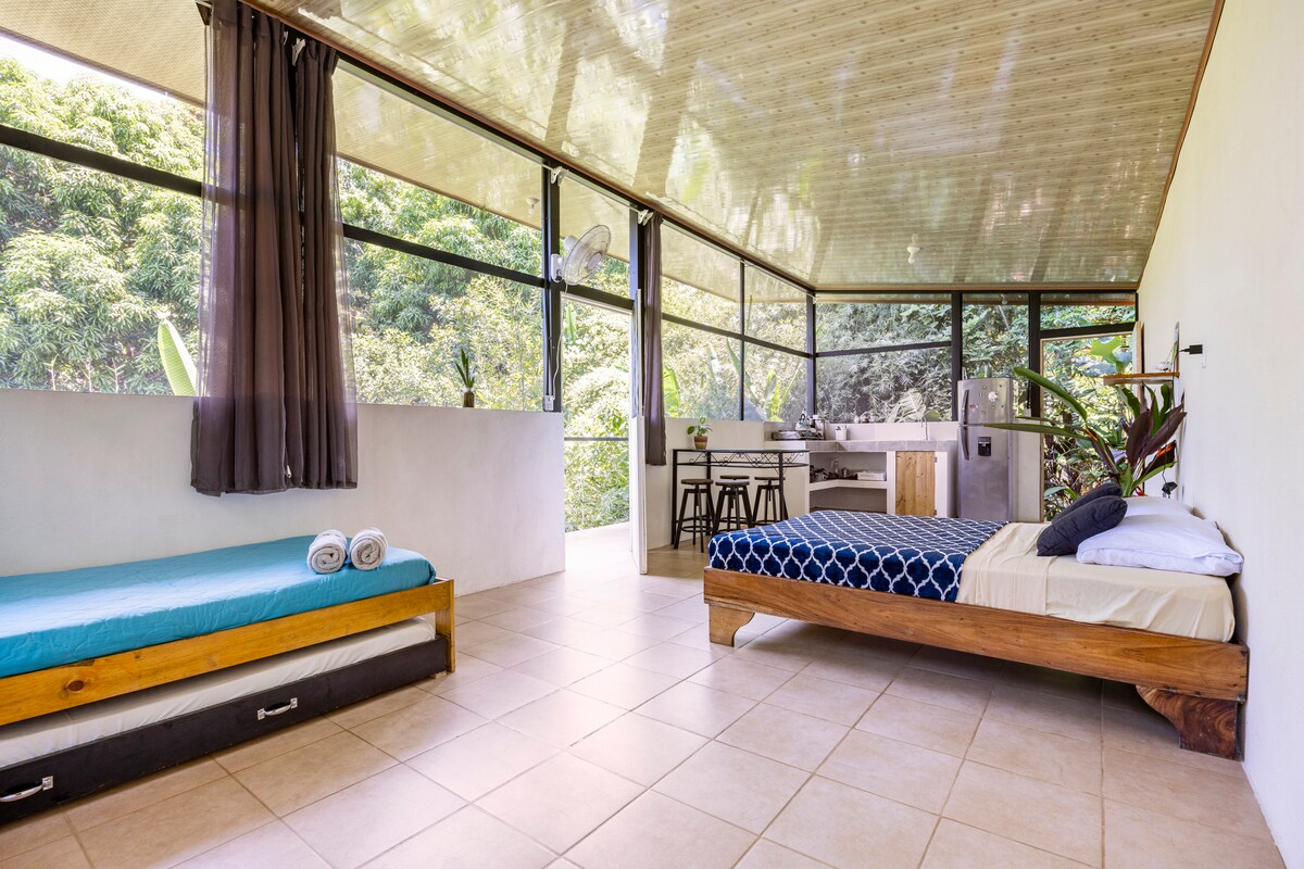 Þetta rúmgóða bústaðarhús í trjáhúsastíl rúmar allt að 4 gesti innan um gróskumikla hitabeltisgróður. Hún er með svefnherbergi með hjónaherbergi, björtu stofusvæði með fullbúnu eldhúsi, sérbaðherbergi og svefnsófa fyrir tvo. Stigi liggur að loftinu þar sem pláss er fyrir tvær auka dýnur. Stóra svölunum bjóða upp á töfrandi útsýni yfir frumskóginn og fugla. Aðgangur að nálægum sundlaugum er í nokkurra skrefa fjarlægð til að slaka á og njóta umhverfisins.
