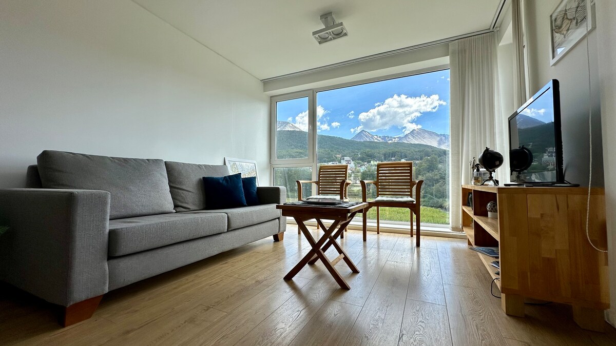 Ný íbúð fyrir 2 gesti (40mts2 tryggð). Mjög björt, róleg og notaleg, með stillanlegri miðstöðvarhitun, fallegu útsýni yfir borgina, Beagle síkið og fjöllin. Staðsett 15 mín ganga eða 5 mín með bíl/leigubíl frá miðbænum (Avenida San Martín) og 15 mín með bíl/leigubíl frá Malvinas Argentinas International Airport. ** mikilvæg útskýring ** Í BYGGINGUNNI ER EKKI LYFTA - þú þarft að klifra upp 2 flug með stiga.