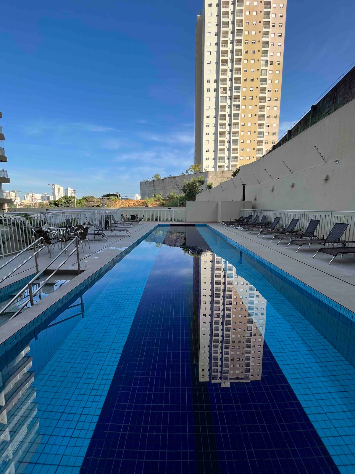 Apartamento studio 32m2, aconchegante e completo. Cama queen, A/C , WIFI 230 MB, aquecedor a gás, smart TV com Chormecast, cozinha completa utensílios, cafeteira elétrica, sala com sofá e mesa de trabalho, berço portatil. Vista livre para praça e central Jd.Colinas. Estacionamento coberto, piscina, lavanderia social, academia, espaço Home Office com WIFI e portaria 24 Horas. Possui fechadura eletrônica e 1 vaga de garagem coberta. O prédio possui mini mercado no andar térreo com diversos itens.