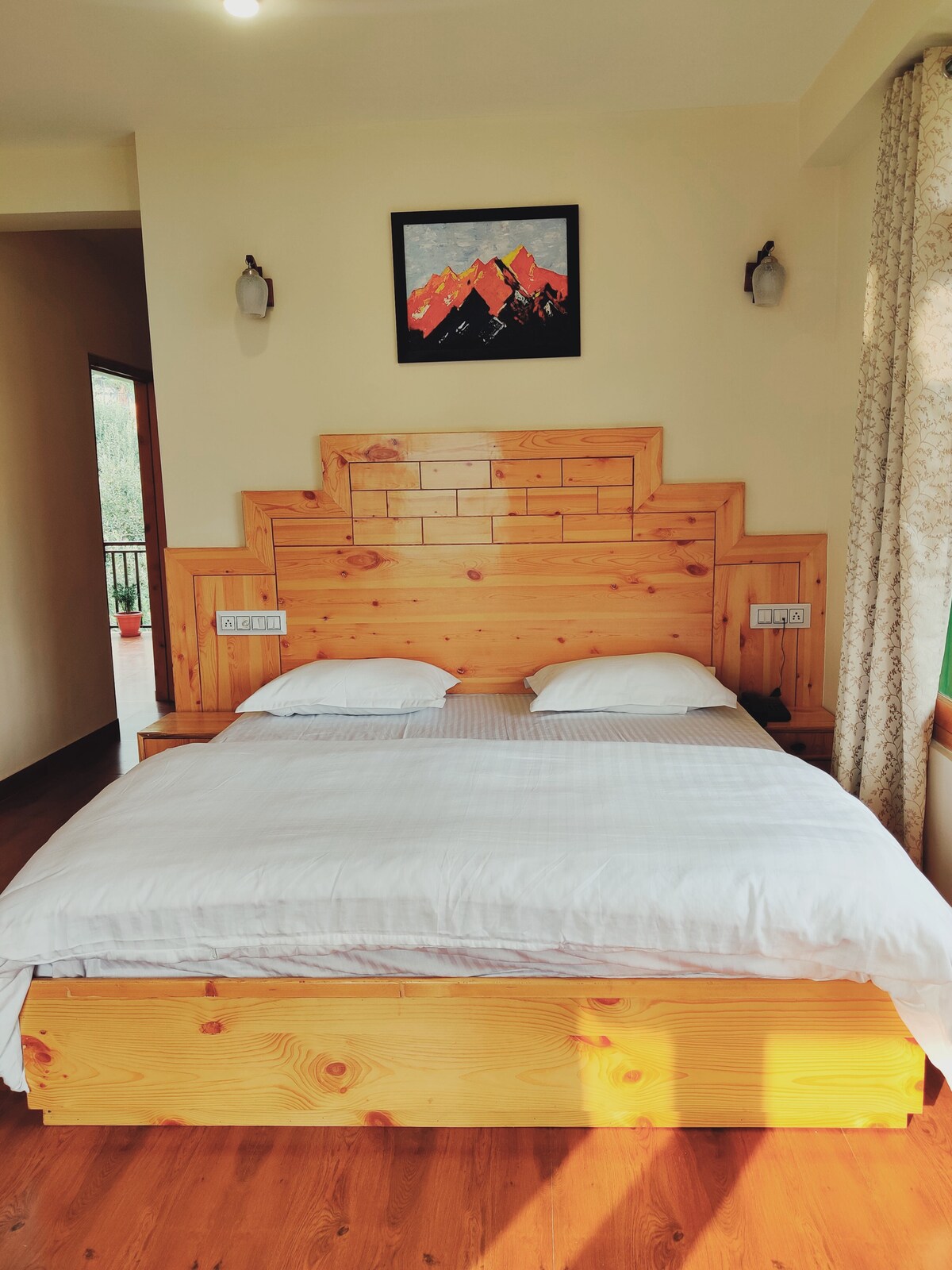 Heiti eignar: The Panorama Retreat, Manali Miðsvæðis | Aðeins 10 mín./1,5 km akstur að Mall Road „Víðáttumikið fjallasýn“ Herbergi staðsett á annarri hæð | Innifalinn morgunverður | Fjallaútsýni | Meðfylgjandi svalir | Innifalinn herbergishitari | Innifalið rúmhitara | Sængur í alpagreinum | Mjög þægileg rúmföt | Aðliggjandi þvottaherbergi | Ókeypis bílastæði á staðnum | Rúmgóð | Tímalausar innréttingar | 43 tommu snjallsjónvarp | Þægindi fyrir te og kaffi | Ketill | Þrifin af fagfólki | Hreinlegt | Heitt vatn