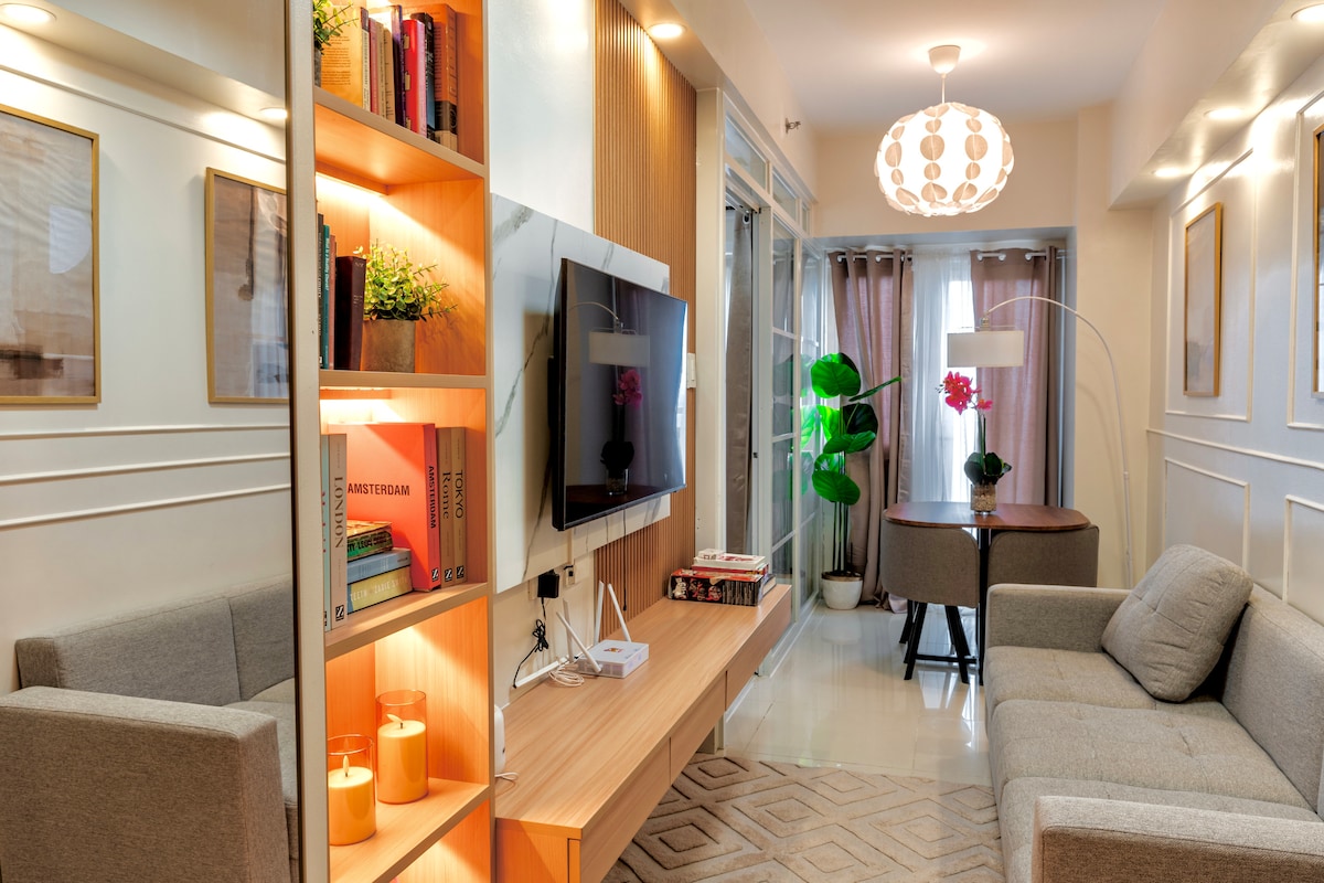 Friðsælt borgarfrí bíður þín í þessari glæsilegu eins svefnherbergis íbúð með svölum við Shore 1 Residences. Í stuttri göngufjarlægð frá Moa og í 15 mínútna akstursfjarlægð frá NAIA (4,5 km) er þetta fullkomin bækistöð hvort sem þú ert í bænum vegna vinnu eða í fríi. Þetta 27 m2 rými er úthugsað og hannað til þæginda fyrir þig. Njóttu nútímalegra atriða á borð við 55” snjallsjónvarp með YouTube og Netflix, notalegan svefnsófa, hratt 200mbps þráðlaust net og þægilegt hjónarúm til að hvílast í eftir langan dag.