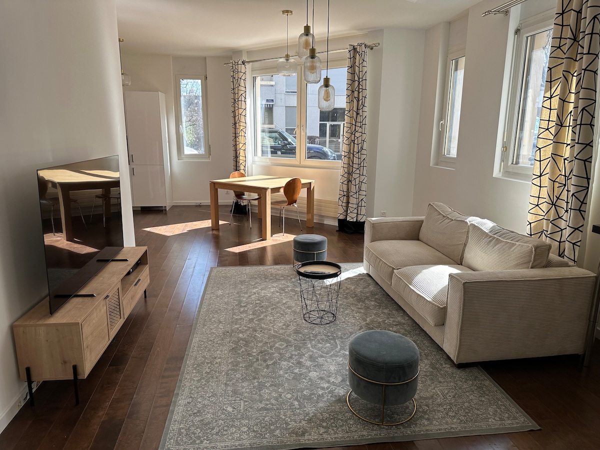 Gaman að fá þig í flott frí í hjarta hins líflega Eaux-Vives í Genf! Þessi glæsilega 1BR-íbúð er í aðeins 5 mínútna fjarlægð frá hinu táknræna Jet d'Eau-vatni og Genfarvatni og er með draumkennt Tempur-rúm, 150”heimabíó, píanó, fullbúið eldhús og sólríkar svalir. Umkringdur kaffihúsum, veitingastöðum og fallegum fjölskylduvænum almenningsgarði verður þú steinsnar frá tengingum við sporvagna, strætisvagna, lestir og báta. Fullkomið fyrir pör og ferðamenn.