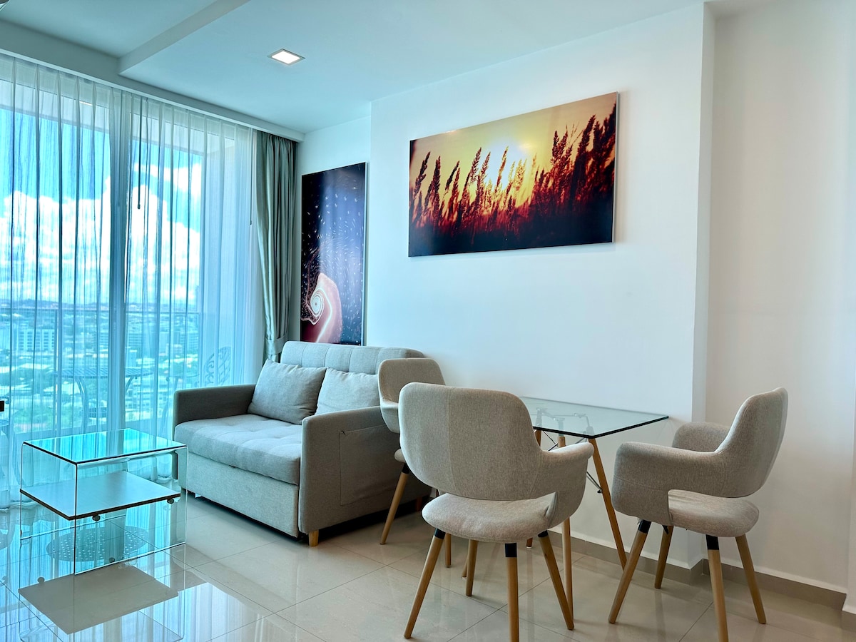 Þessi íbúð með sjávarútsýni er staðsett í hjarta Pattaya og er steinsnar frá ströndinni. Það er stutt í göngugötuna, bryggjuna og Central Malls. Sundlaugin á 31. hæð býður upp á yfirgripsmikið útsýni yfir Pattaya þar sem sjóndeildarhringurinn bráðnar í gylltu sjónarhorni sólsetursins. Að innan blandar glæsilegar hitabeltisskreytingar saman gamaldags sjarma og nútímaþægindum með king-size Sealy dýnu fyrir úrvals svefn. Fullkomin bækistöð fyrir kröfuharða ferðamenn – með kaffi frá Nespresso til að byrja daginn vel.