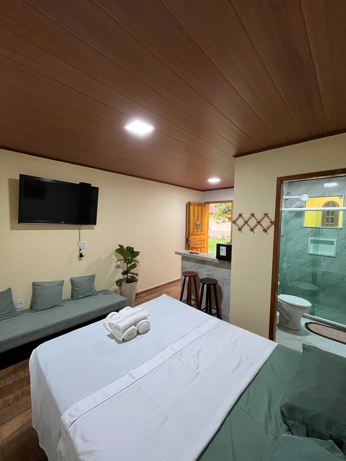 Sérstakt afdrep í Vale das Videiras þar sem kyrrð og náttúra renna saman. Staðurinn er á 1.500 m2 svæði og skógurinn á staðnum tekur vel á móti honum og býður upp á sanna innlifun á friði og þægindum í einstaklega notalegu umhverfi sem er tilvalið fyrir par. Auk fullbúinna innréttinga er Cabana Nascente með sérstöku útisvæði með grilli, borði á yfirbyggðu svæði, útisturtu, hengirúmum og sólbekkjum til að njóta náttúrunnar.