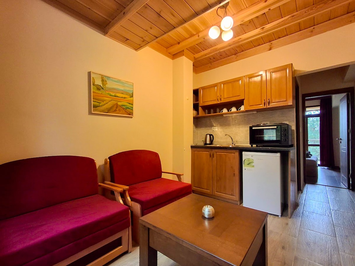 Студио апартаментен тип-спалня, санитарен възел, разтегателен диван, кът за хранене, тераса, кухня (хладилник, котлони, микровълн. фурна, ел. кана за вода, кафе м. Dolce Gusto с 1 бр. капсула на човек/ден. Посетете сайта ни за още предложения и виртуална разходка kleptuzaparts.com В Kleptuz Aparts има 12 апартамента, всеки с различен интериор! На 5 мин. пеша има минерален басейн за обществено ползване.