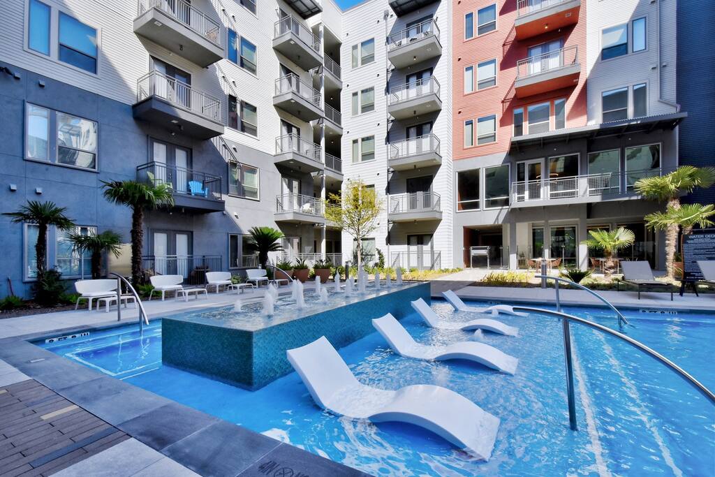 Upplifðu stíl, lúxus og þægindi í fallegu íbúðinni okkar miðsvæðis með aðgang að River Walk. Þetta samfélag státar af hágæða frágangi í hverri einingu með óviðjafnanlegum þægindum eins og líkamsræktarstöð og útisundlaug með útsýni yfir ána. Staðsett á San Antonio River Walk, verður þú að hafa aðgang að bestu verslunum og veitingastöðum ásamt skjótum aðgangi að söfnum, börum og skokkleiðum. Einingarnar okkar eru nútímalegar, þéttbýli og stílhreinar. Bókaðu í dag! Þú verður ekki fyrir vonbrigðum.