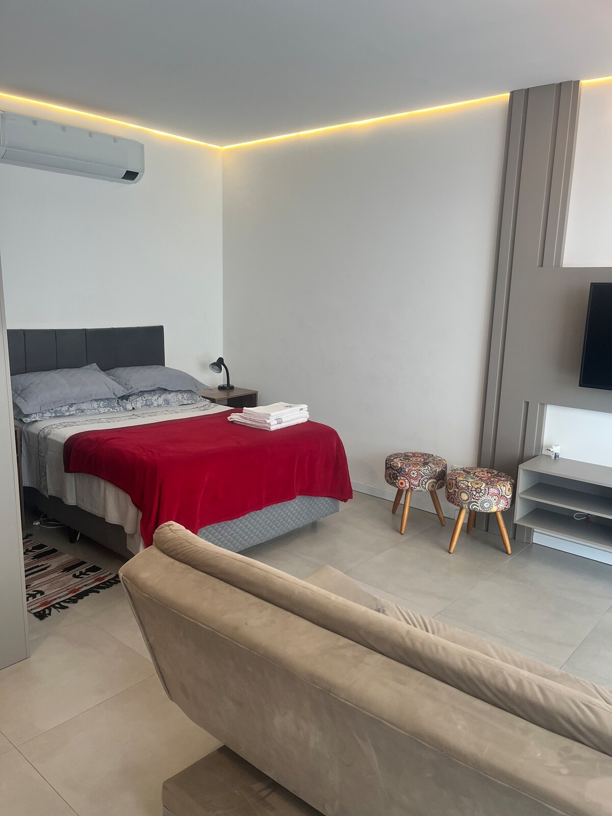 Stúdíó á besta stað á Pelotas. Að eiga frábæra dvöl á fullum og notalegum stað í Una Park, einu af póstkortum Pelotas. Þú fannst hann ! ❤️🍷🍽️😁 Þægindi: - Ný og fáguð bygging til að njóta lífsins - Handklæðaleikur - Hárþurrka - Vinnuborð - Full kennel -Air Fryer, - Spaneldavél,pottar,brauðrist,örbylgjuofn Lautarferðarsvæði fyrir lautarferðir -Þráðlaust net - SmartTV 43" Lg - Heitt og kalt loftræsting - Portaria24h