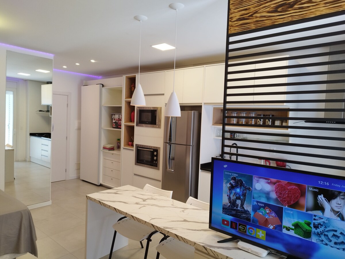 The loft 1612 located in the Canto building, in Una Park, considered the safest open condominium in Pelotas, has all the resources for a comfortable stay. Loftkæling, þráðlaust net 600 mbps, snjallsjónvarp með aðgangi að rásum, þáttaröðum, kvikmyndum, fullbúnu eldhúsi með eldavél, ísskáp, loftkælingu, kaffivél, samlokugerð, rafmagnskrukku, fullu borði, rúmi og baði, 4 koddum, handklæðum og hárþurrku. Þú munt verða undrandi á þægindum þessarar nýuppgerðu eignar!
