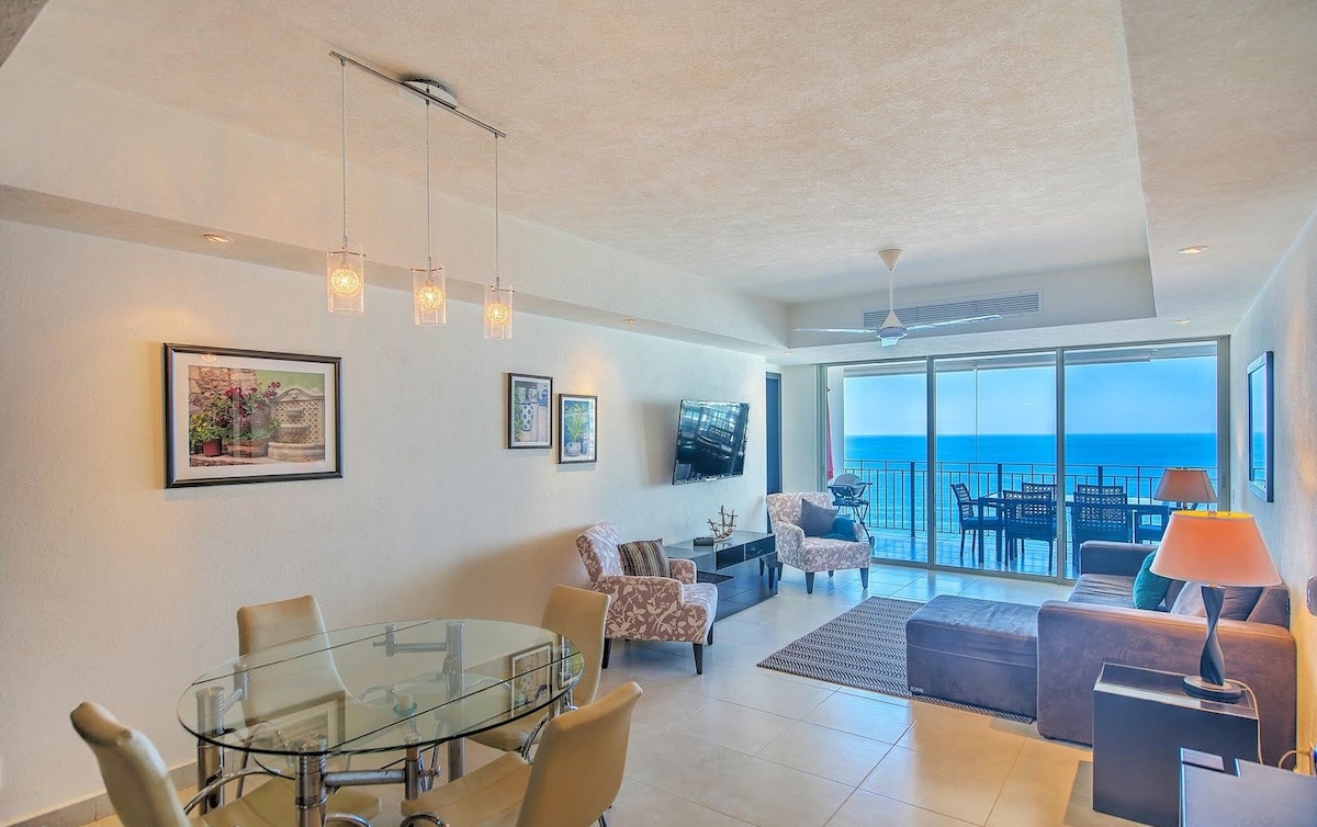 FALLEGT, STÆRSTA EITT SVEFNHERBERGI á Grand Venetian, Frábært útsýni til norðurs og suðurs frá þessari rúmgóðu íbúð á 24. hæð. 1300 fermetra íbúð með vatni að framan, tvö fullbúin baðherbergi, rúmgóð stofa og risastór verönd við vatnið. Bæði svefnherbergið og stofan, hvert með sjónvarpi, opið út á stórar svalir. Skrifborð sett upp og hratt internet. Strönd, 5 sundlaugar, líkamsrækt, heilsulind, tennis. Veitingastaður við hlið með herbergisþjónustu í boði. Við erum 10-12 mínútur frá fullt af verslunum, hvíld. og miðbæ Puerto Vallarta.