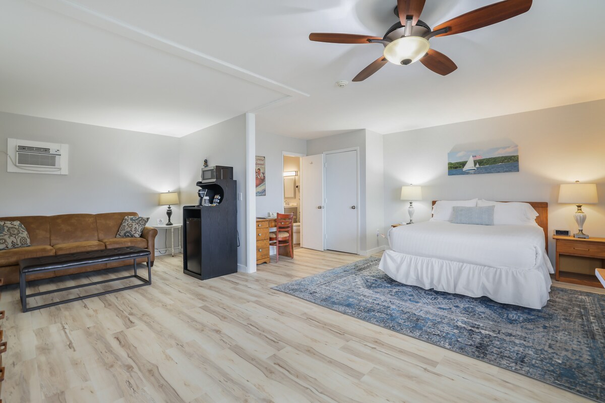 Herbergin okkar í Queen eru að meðaltali 400+ í SF og þau eru með miklu plássi, queen-rúmi, sófa eða setusvæði og undirskriftarskreytingum, þar á meðal óhefluðu trérúmi eða endurheimtum/hreinum húsgögnum. Innifalið í öllum herbergjum eru rúmföt, handklæði, innifalið þráðlaust net, flatskjár með kapalsjónvarpi, örbylgjuofn og ísskápur, kaffivél, loftræsting, straujárn/straubretti og einkabaðherbergi með hárþurrku.