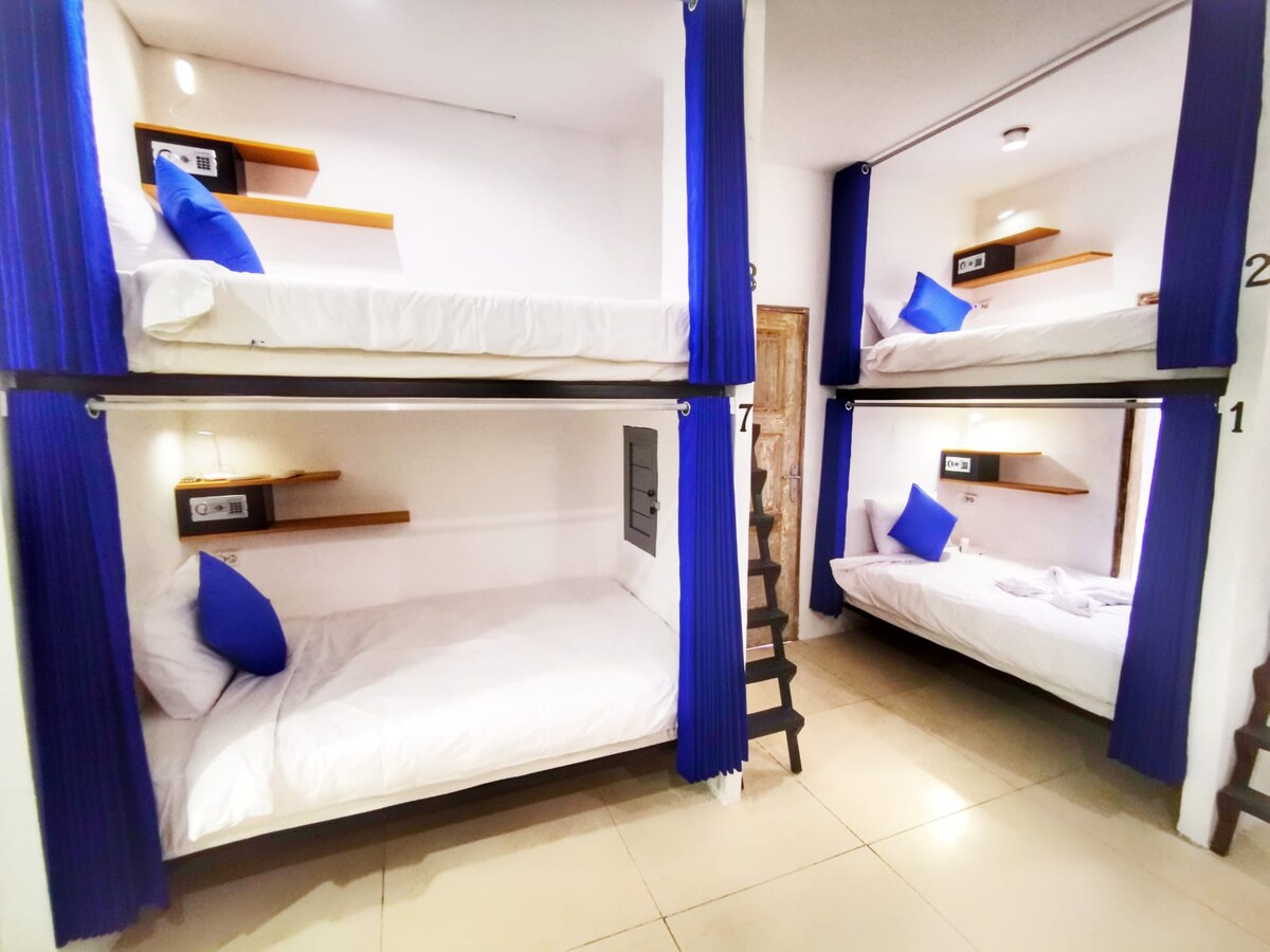 BESTI STAÐURINN TIL AÐ HVÍLA SIG EINKARÝMI / HITTA NÝJA VINI / HLÝLEGAR MÓTTÖKUR / MENNINGARUPPLIFUN Staðsett nálægt flugvelli og aðeins í göngufæri við næstu strönd, verslunarmiðstöð og veitingastaði í Kuta. Farfuglaheimilið okkar er með 22 rúm í samnýtingarherbergi sem býður upp á öll þau þægindi sem þú þarft til að hvíla þig og úrræði. Við erum með okkar eigin kaffihús sem bjóða upp á ýmsa matseðil , þú munt hafa ótrúlega fyrstu og síðustu daga upplifunina sem Kuta hefur upp á að bjóða! Verð í boði er notað fyrir 1 pax / rúm /nótt. morgunverður undanskilinn