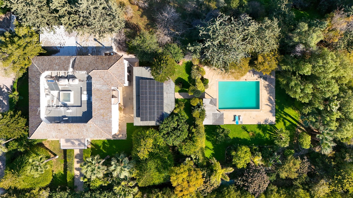Uppgötvaðu þennan friðsæla griðastað þar sem eftirlátssemi mætir ró. Eignin er með flæðandi stofur innandyra, víðáttumiklar verandir, yfirbyggða verönd með grillaðstöðu , stóra sundlaug og risastóran miðjarðarhafsgarð. Í villunni er einnig billjard og borðtennis. Að lokum er boðið upp á lúxus og ánægjulegri gistingu með nuddpotti og gufubaði með greiðslu. Í villunni er sýning á málverkum. Þú getur haft samband við gestgjafana ef þú hefur áhuga á að kaupa eitthvað af málverkunum.