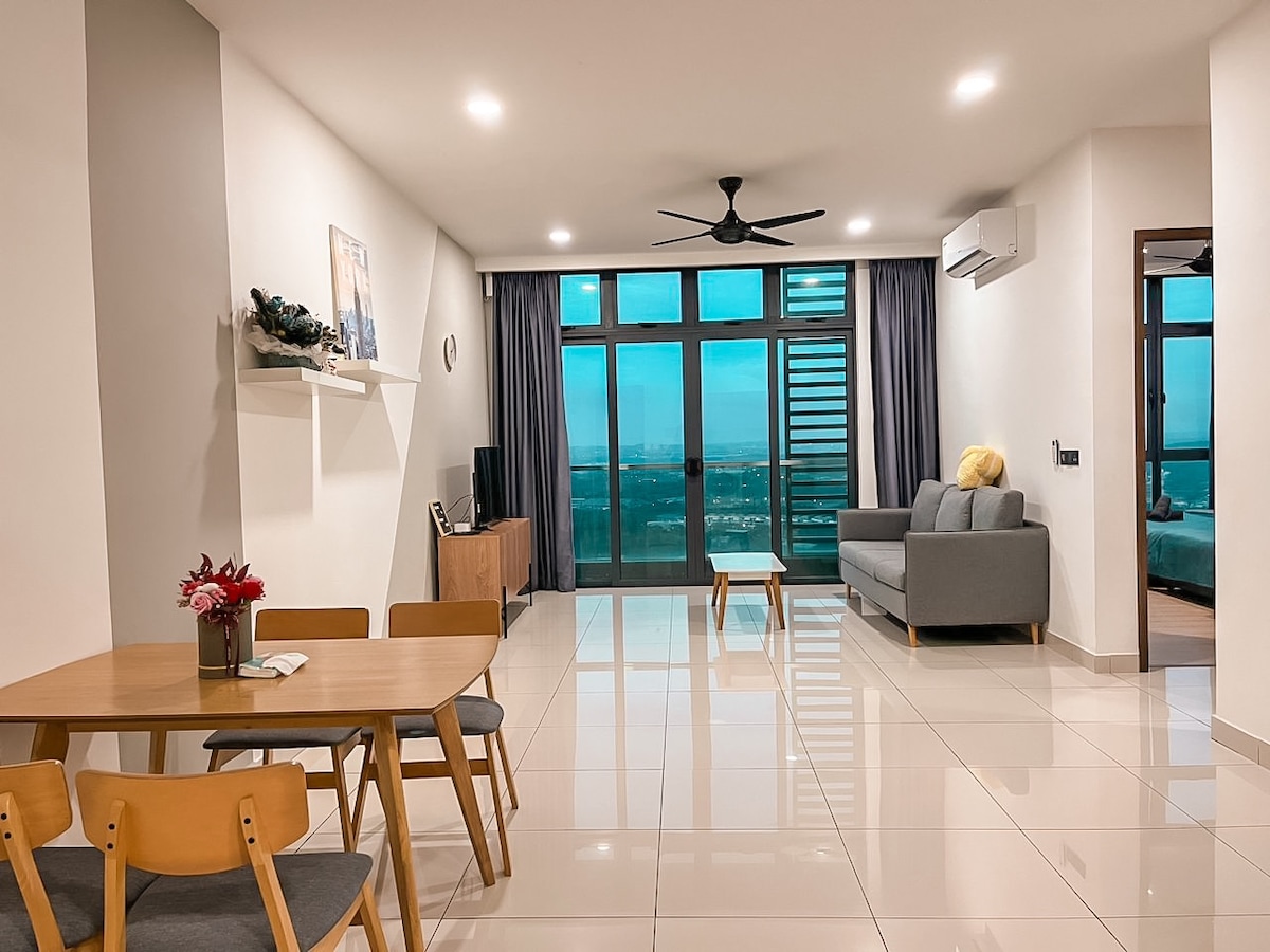 This is a spacious 2Bedroom unit perfectly fit for guests up to 5 pax with total of 1 king size bed 1 queen size bed 1 single bed High floor with high view. 1. Basketball Court 1. Gym Room 2. Function Hall 3. Lounge 4. Library 5. Manicure Shop 6. Mini Theatre 7. BBQ Deck 8. Swimming Pool 9. Sauna 10. Jacuzzi 11. Game room (Pool Table, PS Room, Darts and more) 12. Laundry 13. Mini Market -Sky Garden Guest are not allow to smoke in the room , please smoke at the balcony if needed