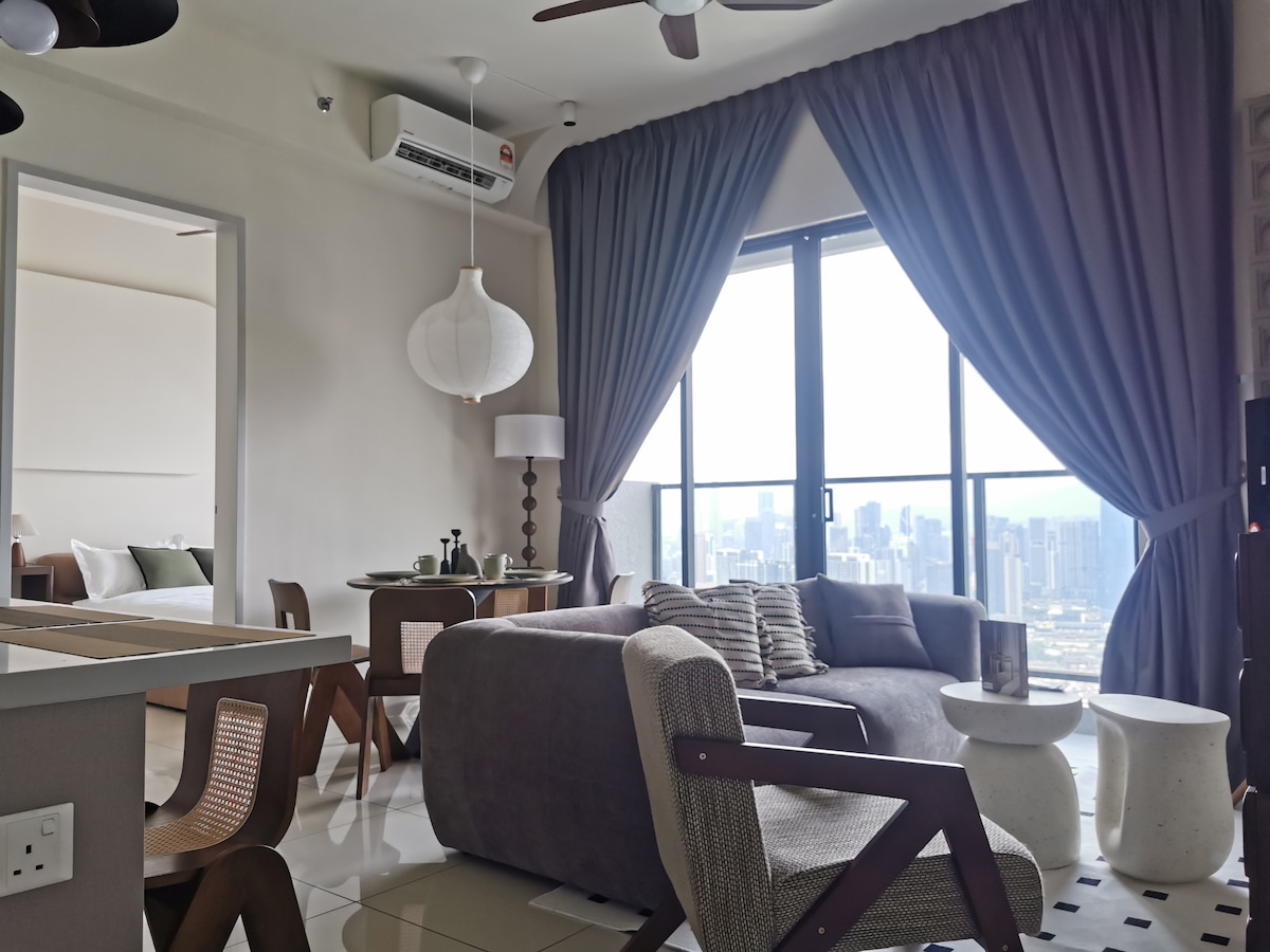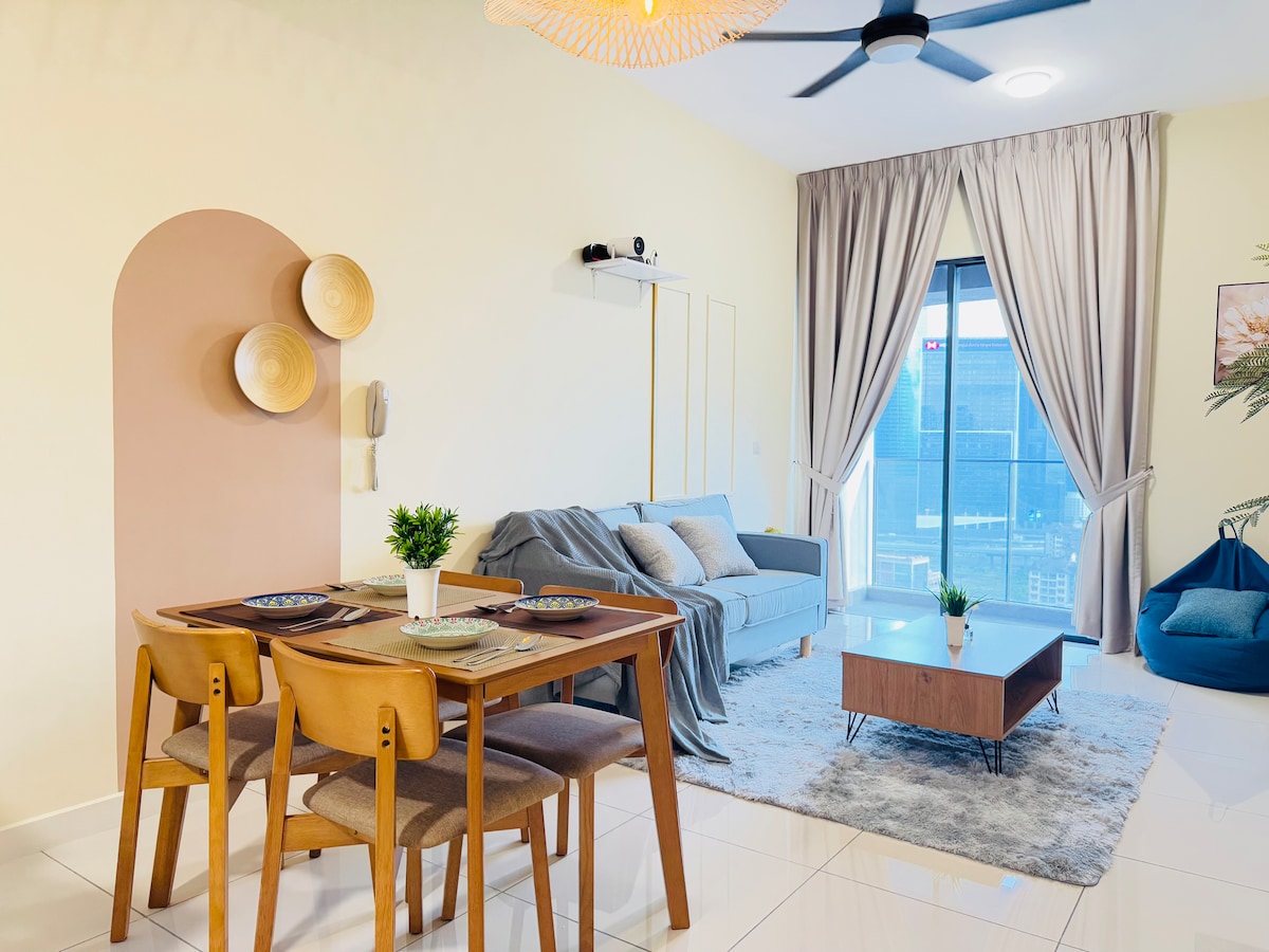 Gistu í glæsilegu tveggja herbergja íbúðinni okkar í Continue Residence sem er fullkomin fyrir fjölskyldur eða litla hópa. Í hverju svefnherbergi er rúm af queen-stærð sem rúmar allt að fjóra gesti. Njóttu glæsilegs TRX-útsýnis frá gluggum sem ná frá gólfi til lofts og slakaðu á í notalegu stofunni. Íbúðin er með eldhúskrók, borðpláss og greiðan aðgang að Bukit Bintang, Pavilion og fleiru. Tilvalið fyrir fjölskyldur eða viðskiptaferðamenn sem vilja þægindi og þægindi.