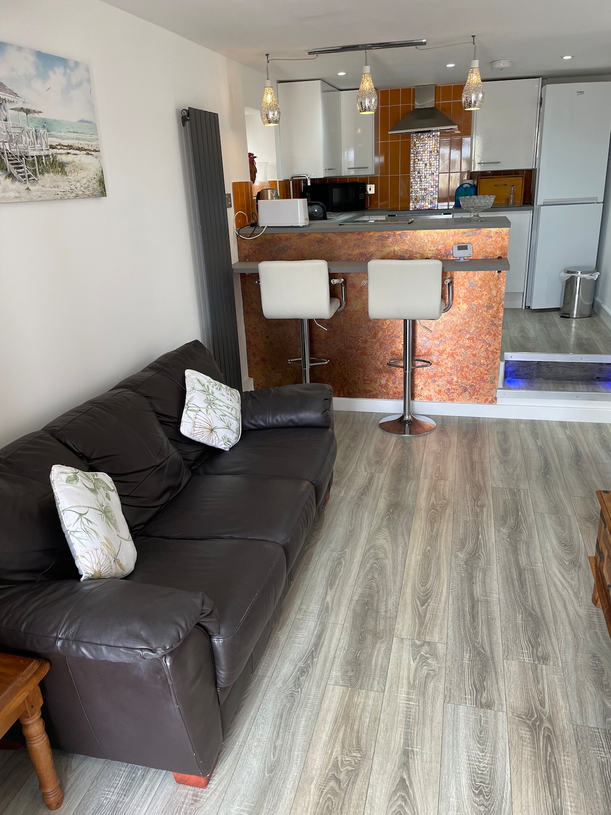 Small garden flat adjoined to beachfront house. Open plan lounge leading to fully equipped kitchen with breakfast bar & stools. Double bedroom with king size bed, shower room with basin & w/c. Outside is a sunny enclosed patio area with table chairs and BBQ. Allocated off road parking on site. Steps at the side of main house lead to a dog friendly private beach with seating for you to enjoy the fabulous sea views. Pevensey bay village is 1.2km away & has pubs, cafes & restaurants.