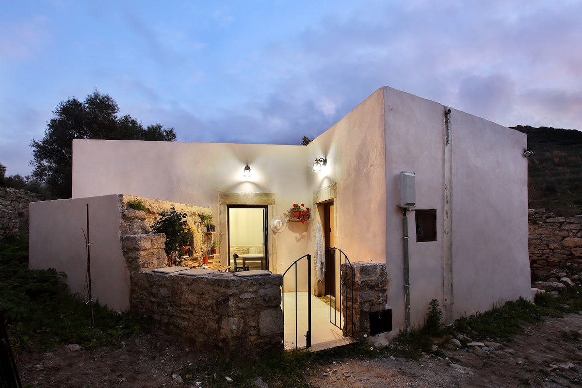 Charoupia cottage is part of 300 years old small hamlet, it is a Petite traditional cottage suited on the hillside among olive groves and carob trees overlooking the Mediterranean sea. In the valley of the White River and the gorge of Pefki Ideal for nature lovers, only 900m from the beaches, tavernas and shops of harbour town Makrigialos at the foot of the Pefki Gorge this area offers fantastic opportunities for those who love walking & nature With high speed internet & top quality mattresses
