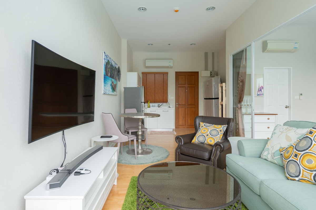 Þetta aðgengi að sundlaug með 1 svefnherbergi (43fm) er staðsett á jarðhæð í nýrri byggingu við Boathouse Hua Hin Condominium, við hliðina á Airport Bus Station. Það býður upp á beinan aðgang að fallegri sundlaug og notalegt andrúmsloft. Íbúðin er fullbúin húsgögnum með flottum og vönduðum munum og er með 55 tommu snjallsjónvarp með hljóðstiku. Fáðu ókeypis síað drykkjarvatn, fullbúið eldhús og 300/300 Mb/s þráðlaust net með ljósleiðara til einkanota. Auðvelt er að ná í gripinn.