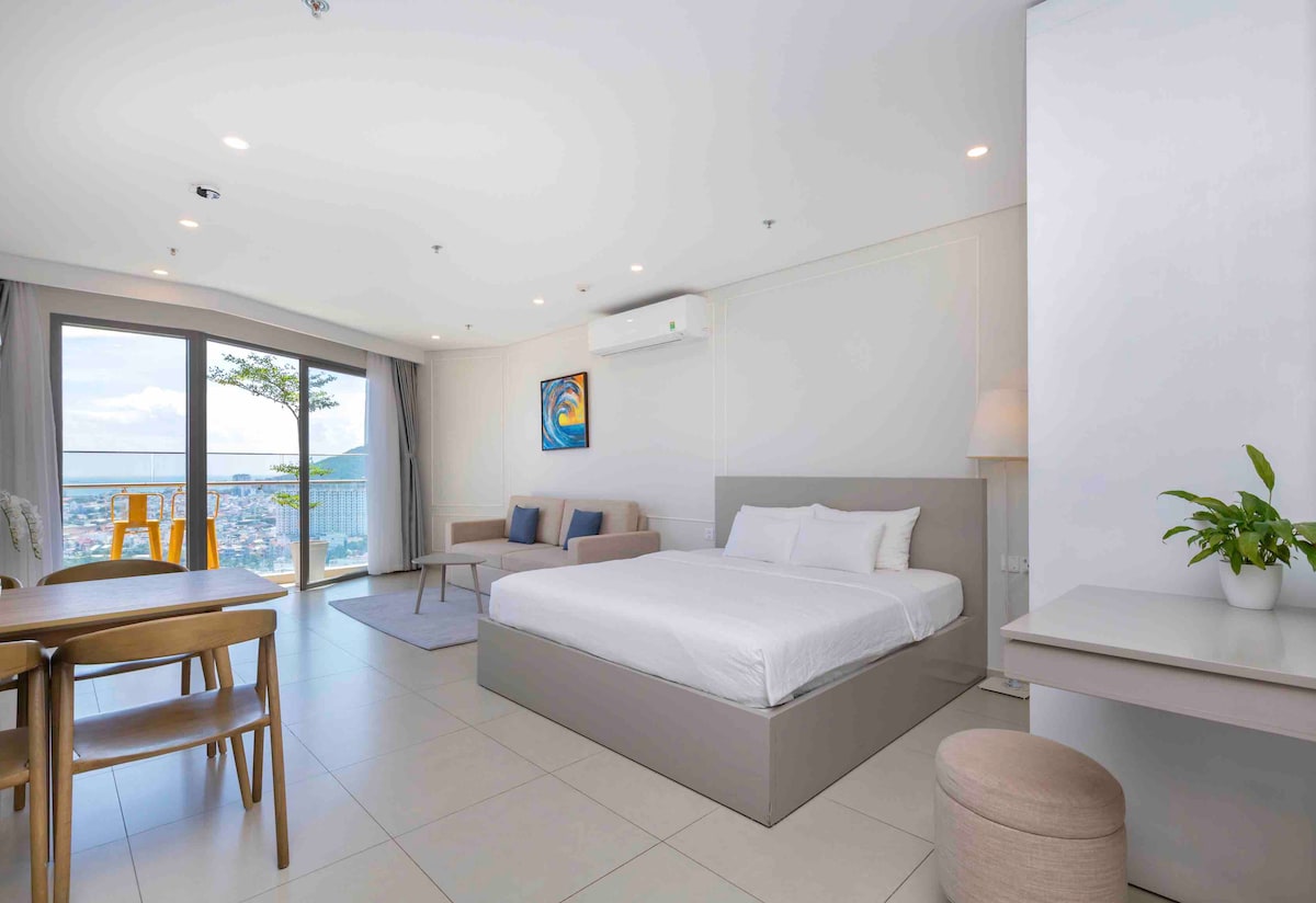 Minimalísk, fullbúin 1BR-íbúð á 15. hæð með mögnuðu sjávarútsýni. Tilvalið fyrir pör eða fjölskyldur með eitt barn yngra en 5 ára. Fullkomlega staðsett við hliðina á Back-ströndinni (ThuŌ Vân-strönd). Áætlaður göngutími að þægindum í nágrenninu: - 2 mínútur að ströndinni hinum megin við götuna - 5 mínútur í næstu verslun sem er opin allan sólarhringinn (GS25) - 8 mínútur í næsta stórmarkað (Lotte Mart) Hraðlyftur. Ókeypis Netflix. Við erum einnig með eitt mótorhjól til leigu.