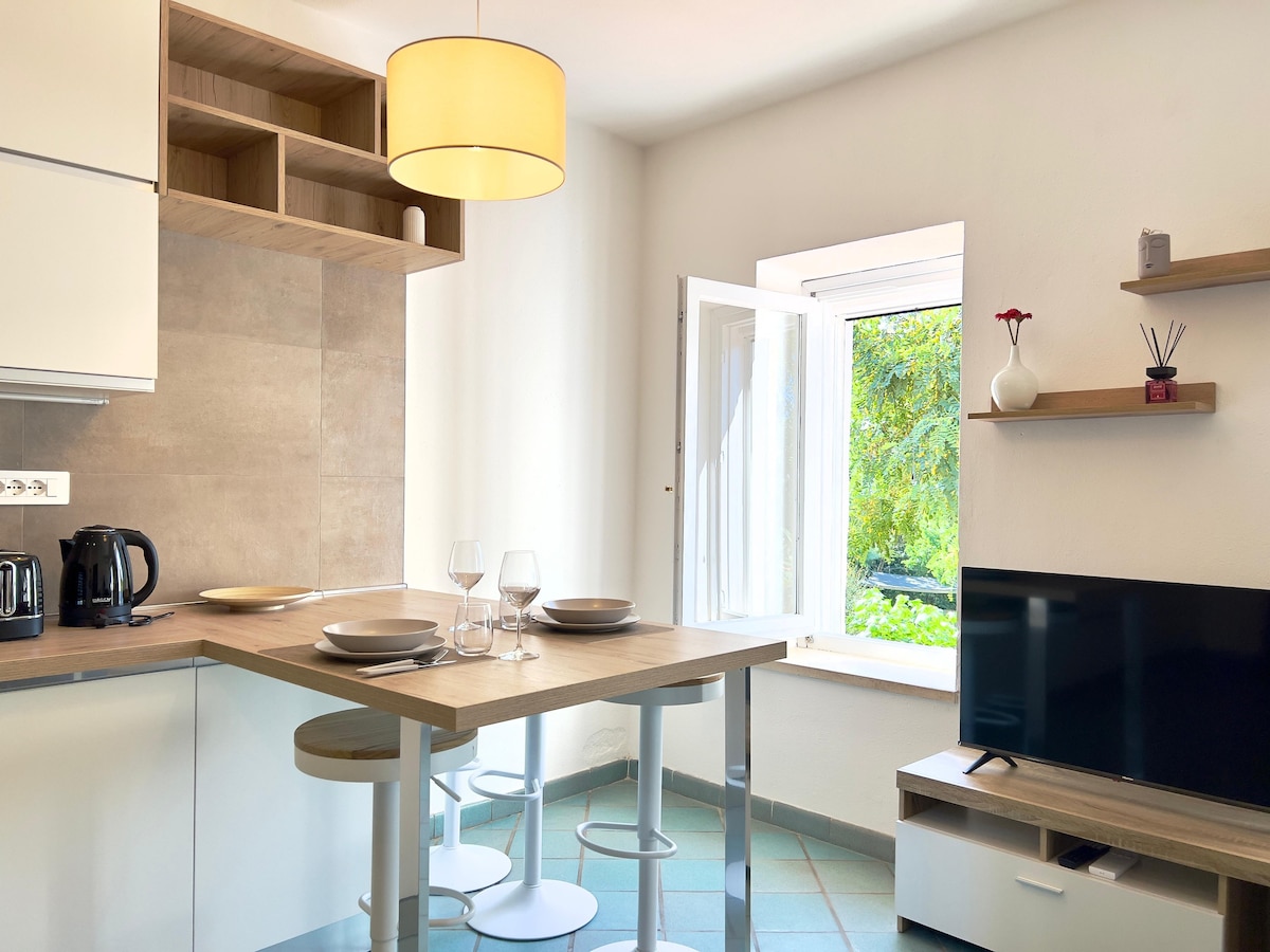 Tveggja herbergja íbúð á tveimur hæðum, nýlega uppgerð með smekklegum innréttingum: stofa með svefnsófa (1 ferfet og hálft), borðstofuborði, sjónvarpi og þráðlausu neti. Eldhúskrókur með ofni , ísskáp og uppþvottavél. Baðherbergi með sturtu, salerni og innréttingu. Tvöfalt svefnherbergi uppi, opið. Farðu út á verönd fyrir framan fullbúna eign. Upphitun (frá 15/10 til 15/04) , flugnanet. Leyfilegt að vera með lítil til meðalstór gæludýr. Sundlaug ( opin frá 01/06 til 30/09) sem er deilt með Solengo íbúð