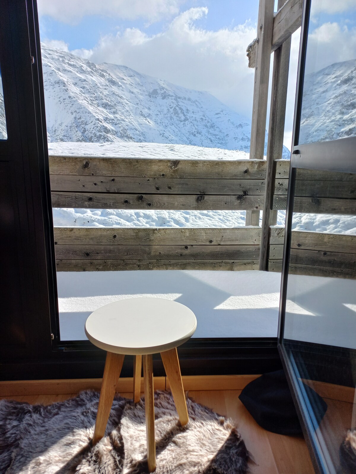 Trékokkskáli á sama tíma nútímalegur, lítið setusvæði þar sem þú getur hvílt þig. Björt innrétting með náttúrulegri birtu og lítilli skyggðri viðarverönd þar sem þú getur fengið þér máltíðir og fengið þér blund á þilfarsstólum eða dáðst að fallegu tindunum okkar. Claude & Nathalie