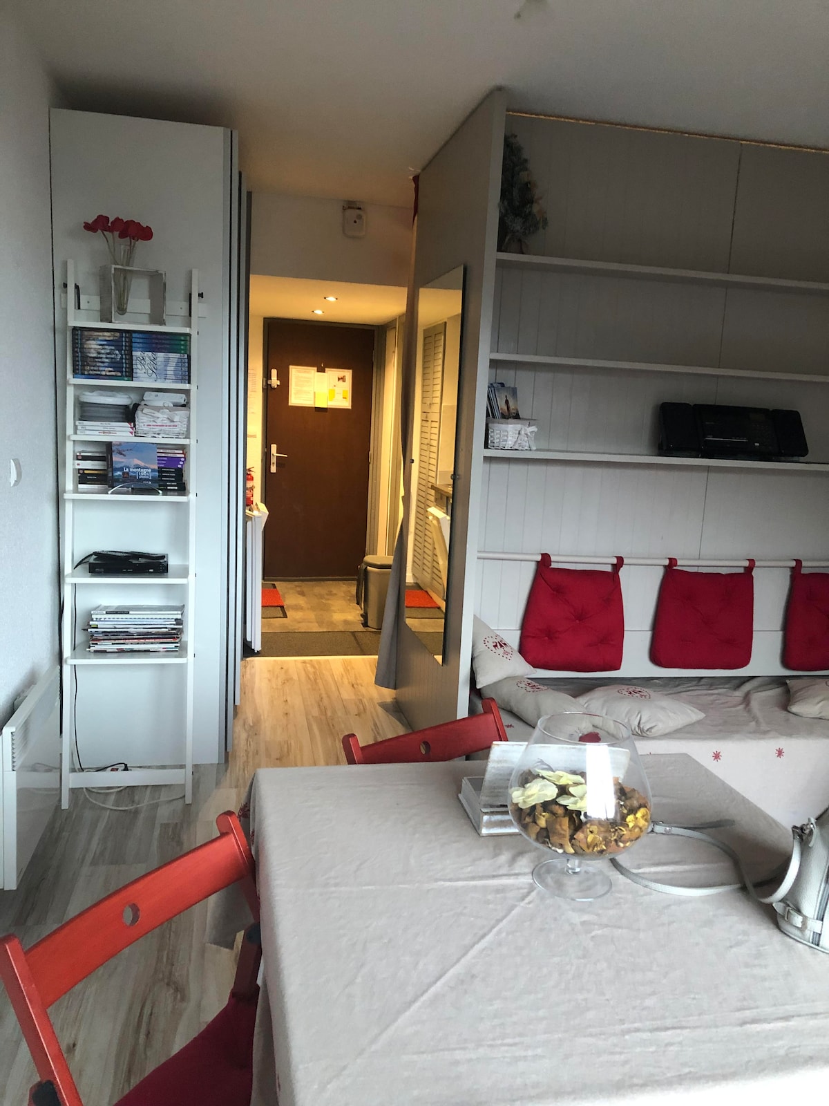 Orlofsleiga fyrir 4 manns (2 fullorðnir og 2 börn eða 3 fullorðnir og 1 barn) 19 m2 í Piau Engaly, Résidence Gentianes 2. North West Exposure Engin dýr Inngangur með 2 kojum aðskildum með hurð frá aðalherberginu með eldhúskrók, 140 rúm sem leggja saman í skápinn við vegginn. Ekki er boðið upp á tveggja sæta sófa. Skíðaskápur. Kjallari til að geyma ferðatöskur, matvörur. Sjálfsinnritun. Brottför frá byggingunni með skíðum á.