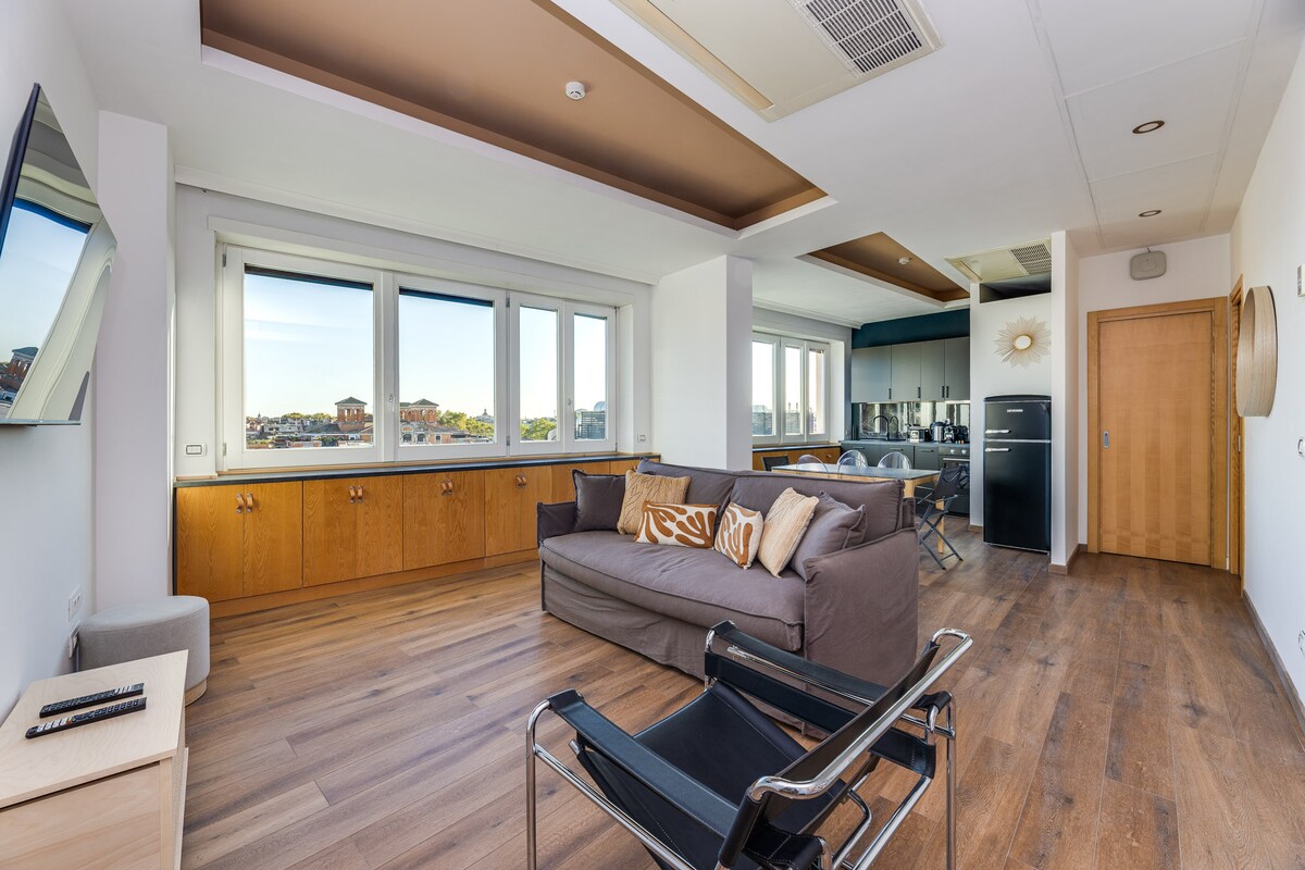 Þessi bjarta og rúmgóða risíbúð var nýlega alveg endurnýjuð. Breiður gluggaveggur snýr að Tíberánni og hleypir miklu sólarljósi inn. Það eru falleg Toskana bómullargólf og nútímaleg hönnunarhúsgögn. Það er nýtt fullbúið eldhús með Nespresso-kaffivél, loftkælingu, hitakerfi með stillanlegu hitastigi, ótakmörkuðu þráðlausu neti, þvottavél/þurrkara, baðherbergi með baðkeri og sturtu. Íbúðin rúmar fjórar manneskjur í king-size rúmi og þægilegum king-svefnsófa