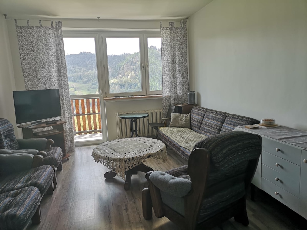 Mieszkanie z pięknym widokiem na górskie krajobrazy Pienin, położone jest w centrum zdrojowym Szczawnicy, w cichej okolicy przy samym Parku Górnym. Mieszkanie składa się z 3 pokoi (2 niezależne sypialnie + salon z rozkładaną 2 osobową sofą), balkonu, wyposażonej kuchni oraz łazienki. Z okna sypialni rozpościera się widok na stok narciarski "Palenica", który znajduje się w odległości ok. 500 m od mieszkania.