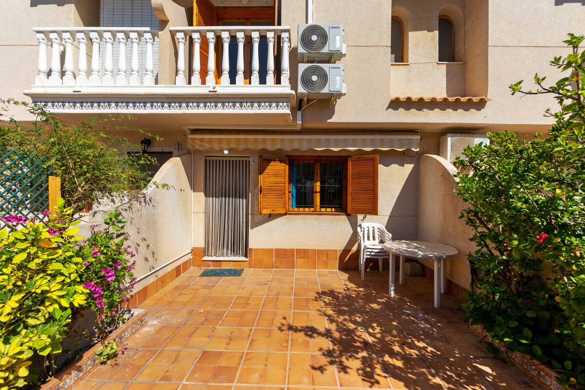 Þetta einkarekna einbýli nálægt Villamartin-golfvellinum er með 2 svefnherbergi og 1 baðherbergi, fullbúið eldhús og glæsilega þakverönd með borðstofu og grilli. Lítil íbúðarhús eru nýuppgerð, þar á meðal glæný loftræsting, eldhústæki, rúm, dýnur og húsgögn. Það er einkarekin samfélagssundlaug (1 mín. ganga), Villamartin-golfvellir (2 mín. akstur) og ein stærsta verslunarmiðstöð Zenia Boulevard fyrir allt sem þú þarft (5 mín. akstur).