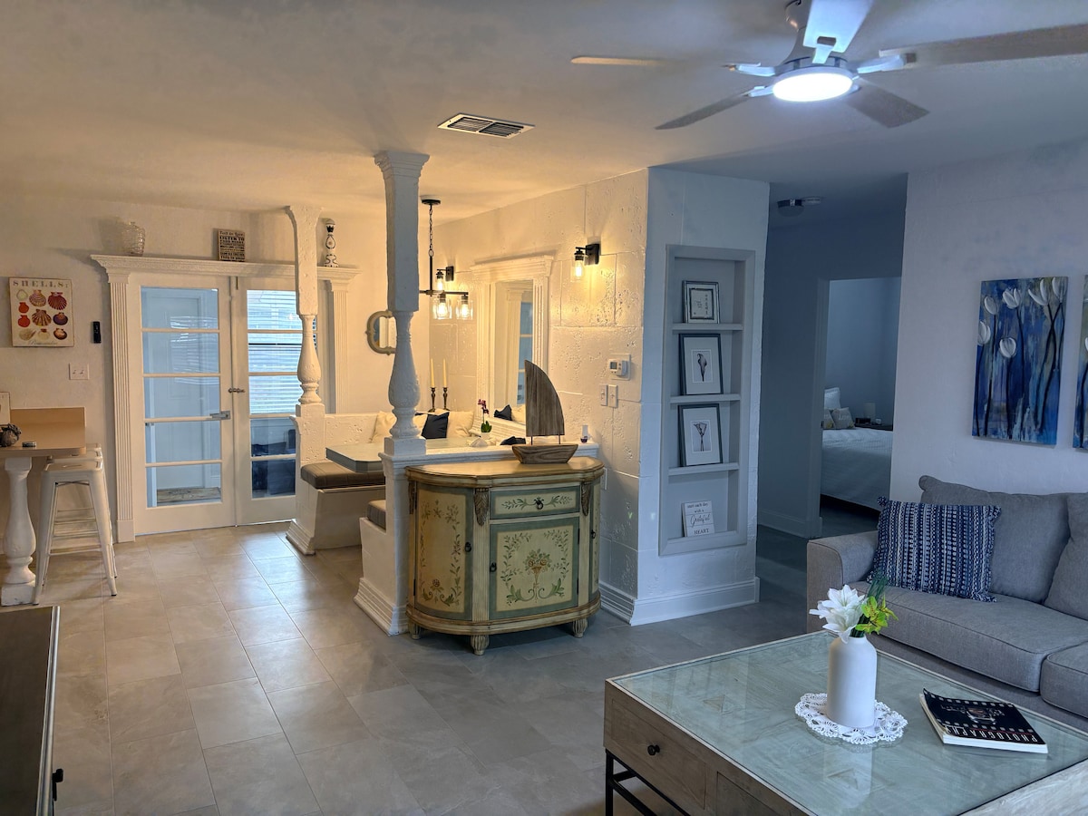 Gaman að fá þig í afdrepið þitt á Foxtail Palm! Vandlega sérvalið athvarf sem er hannað til að fara fram úr væntingum þínum. Þessi gamaldags dvalarstaður er staðsettur í hjarta Pinecraft, hinu virta hverfi Central Sarasota, og býður upp á kyrrð í bakgrunni heillandi ísstofa, gjafavöruverslana og líflegra markaða á staðnum. Njóttu góðs af því að fá eitt ókeypis bílastæði og ótakmarkaðan aðgang að þvottavél og þurrkara sem tryggir snurðulausa og stresslausa upplifun meðan á dvölinni stendur.