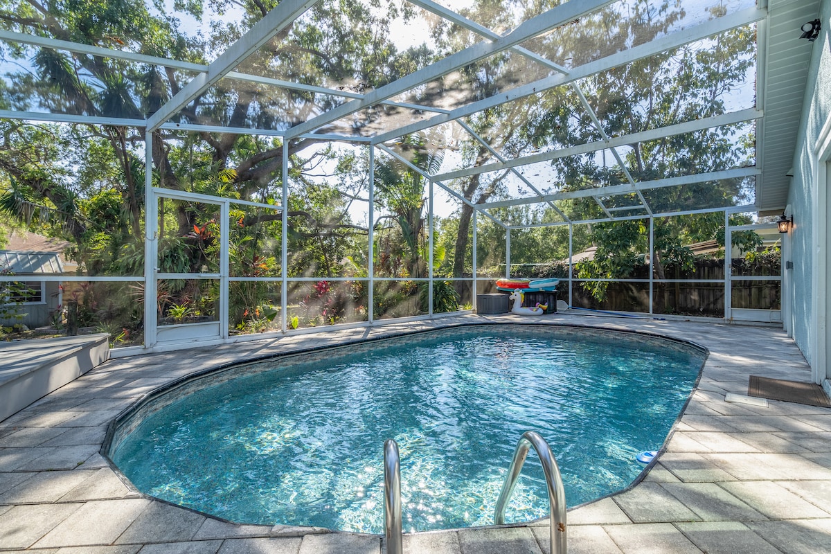 Verið velkomin í Palm Tree Cottage. Þetta 4 svefnherbergja og 2 baðherbergja sundlaugarheimili væri fullkomið fyrir næsta fjölskyldufríið þitt. Bakveröndin og sundlaugarsvæðið er GLÆNÝ og fallega gert. Í lauginni er búr til að draga úr áhyggjum með minnstu gestunum okkar. Miðsvæðis við margt af því sem Sarasota hefur upp á að bjóða. - Mínútur frá Pinecraft og nokkrum veitingastöðum og ísbúðum - 20 mín í bæði Lido og Siesta Key - Nokkurra mínútna göngufjarlægð frá Legacy Trail, Pompano Pickle Ball-völlunum VR25-00084