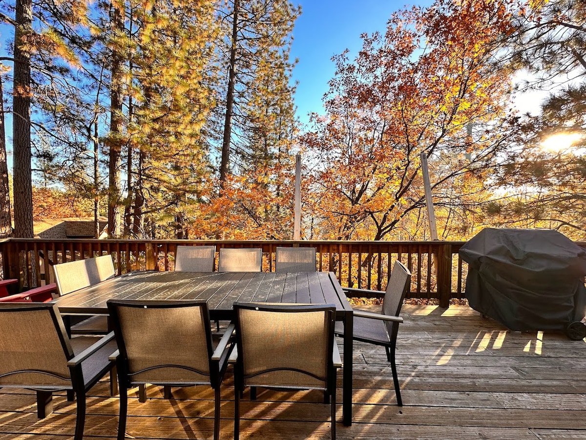 Eftir útivistardag getur þú slakað á í einu stærsta AirbnbBnbs við Pine Mountain Lake. Fjölskylda þín og vinir geta dreift úr sér yfir ~4000 fm af lúxusskipaðri vistarverum sem innihalda nauðsynleg nútímaþægindi. Njóttu tveggja stórra þilfara með útsýni yfir gulch / vatnið fyrir neðan. Þú verður með aðgang að brattri (250 tröppum niður brattari hæð) að einkabryggju við vatnið með kajökum, gönguleiðum, sundi, tennis, golfi, veiði og dagsferðum til Yosemite.