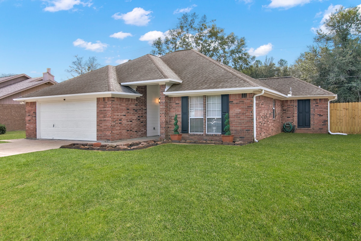 Mom & Pop feel!! FULLY FUNCTIONAL PRIVATE HOME & PARKING. Skemmtilegur, einkarekinn bústaður, í blindgötu fjarri öðrum heimilum. Notalegt, rúmar 4, nóg af öruggum bílastæðum við sjón, þráðlaust net, snjallsjónvarp, staðbundið sjónvarp og aðgangur að streymisaðgöngum. Þvottavél/þurrkari á heimilinu. Þroskuð tré og verönd að framan með garði Miðlæg staðsetning-auðvelt aðgengi að iðnaðarvinnusvæðum. 2 mílur=Interstate 3 mílur=SuperWalmart 3 mílur=Veitingastaðir/bar og grill 14 mílur=Kvikmyndahús Rólegt hverfi/ Wooded lot Country in the City