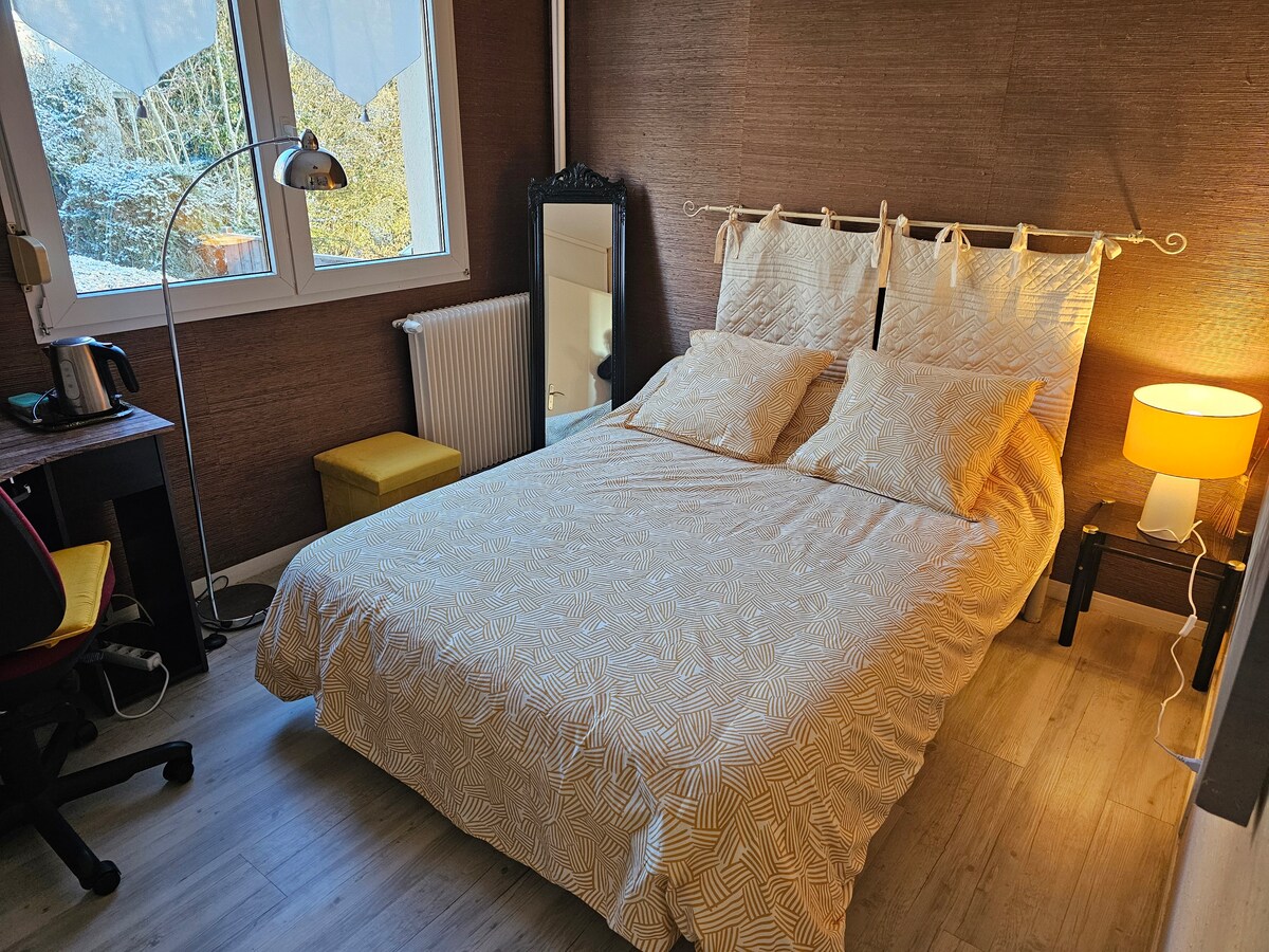 💚 FERÐALÖG eða GISTING ❤ 2 manneskjur (+2 börn möguleg!) 💚 Allt til að vera SJÁLFSTÆÐUR! Ókeypis inngangur, wifi, USB-tengi, BÍLASTÆÐI, eldhús, BAKARÍ 2 mín ganga, ÞÆGINDI +++ 💚Hvað sem er til að sjá um þig! ÚRVALSRÚMFÖT, snyrtilegar innréttingar, RÓLEG gisting, ljúf sælgæti, fagurfræðileg stofnun á 2 mín. 💚 Allt til að sjá um! NETFLIX aðgangur, leikir, leiðbeiningar um góðar skemmtiferðir, GARÐUR rétt við hliðina á bústaðnum..