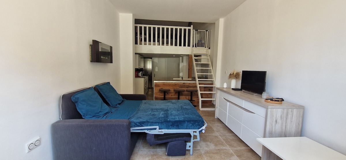 Logement de type F2 neuf, en bas de villa avec vue sur la mer. Cuisine équipée, salle de bain avec douche italienne, chambre avec lit en 160, salon avec canapé convertible, cellier avec machine à laver,sèche linge et congelateur. L’appartement possède une grande terrasse avec barbecue et vue sur la mer. Proche de toutes commodités, à 150m du supermarché casino, et à 2 minutes des plages et du centre ville.
