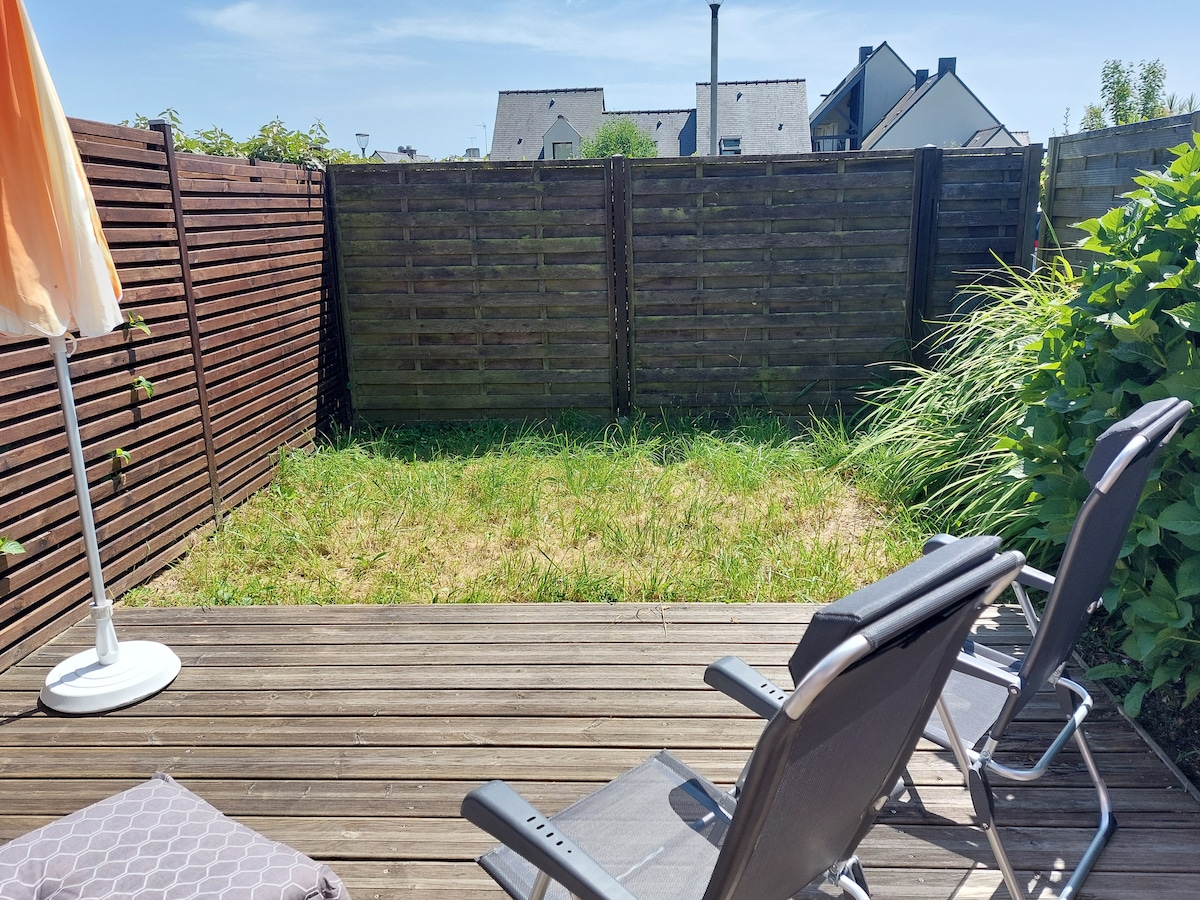 Lítið, mjög gott og hljóðlátt hús í 200 metra fjarlægð frá ströndum og GR 34 strandslóðinni með útisundlaug (frá 15. júní til 15. september) Gestir geta nýtt sér sólarveröndina eða borðspilin sem eru í boði. Þú finnur hjólabrettagarð, veitingastaði og verslanir í innan við 5/10 mínútna göngufjarlægð. Rúmið verður tilbúið ásamt baðhandklæðum og strandhandklæðum. Húsið rúmar 2 fullorðna og þar er enginn búnaður fyrir börn.