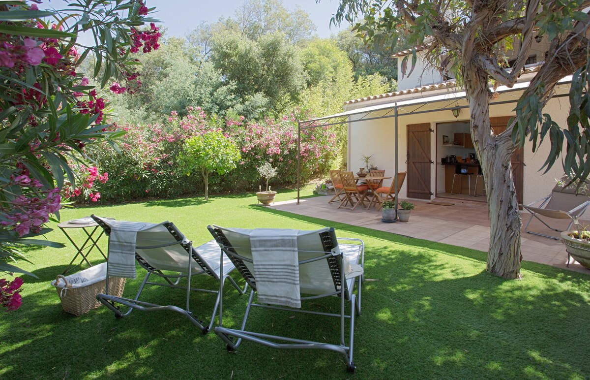 Rólegt, þægilegt og sjór fótgangandi! Fullkominn staður fyrir afslappandi frí í Le Lavandou þar sem allt er fótgangandi. Nútímaleg og vandlega endurnýjuð íbúð, 100 m frá ströndinni í Cavalière. 26 m2 innréttingar + 30 m2 verönd og 30 m2 garður. Tilvalið fyrir fjóra: 140 rúm + 140 svefnsófi, vel búið eldhús (ofn, örbylgjuofn, uppþvottavél), sjónvarp, þráðlaust net,loftræsting, rúmgóð sturta og þvottavél. Grill, setustofa ⚠️bókanir fyrir júlí-ágúst eru aðeins frá laugardegi til laugardegi