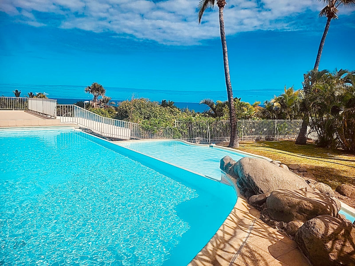 Lúxus íbúð sem býður upp á frábæra þjónustu, með stórkostlegu útsýni yfir Indlandshaf, sturtu, óendanlega sundlaug, loftkælingu, einkabílastæði, 10m2 verönd, 110cm sjónvarp með mjög háhraða internet trefjum. Ti'Mat er alvöru kúla! Fáðu þér morgunverð, fordrykk eða kvöldmáltíð fyrir framan hvalaskrúðgönguna eða frábært sólarlag sem verður fyrir framan þig. Ógleymanleg dvöl, einfaldlega...