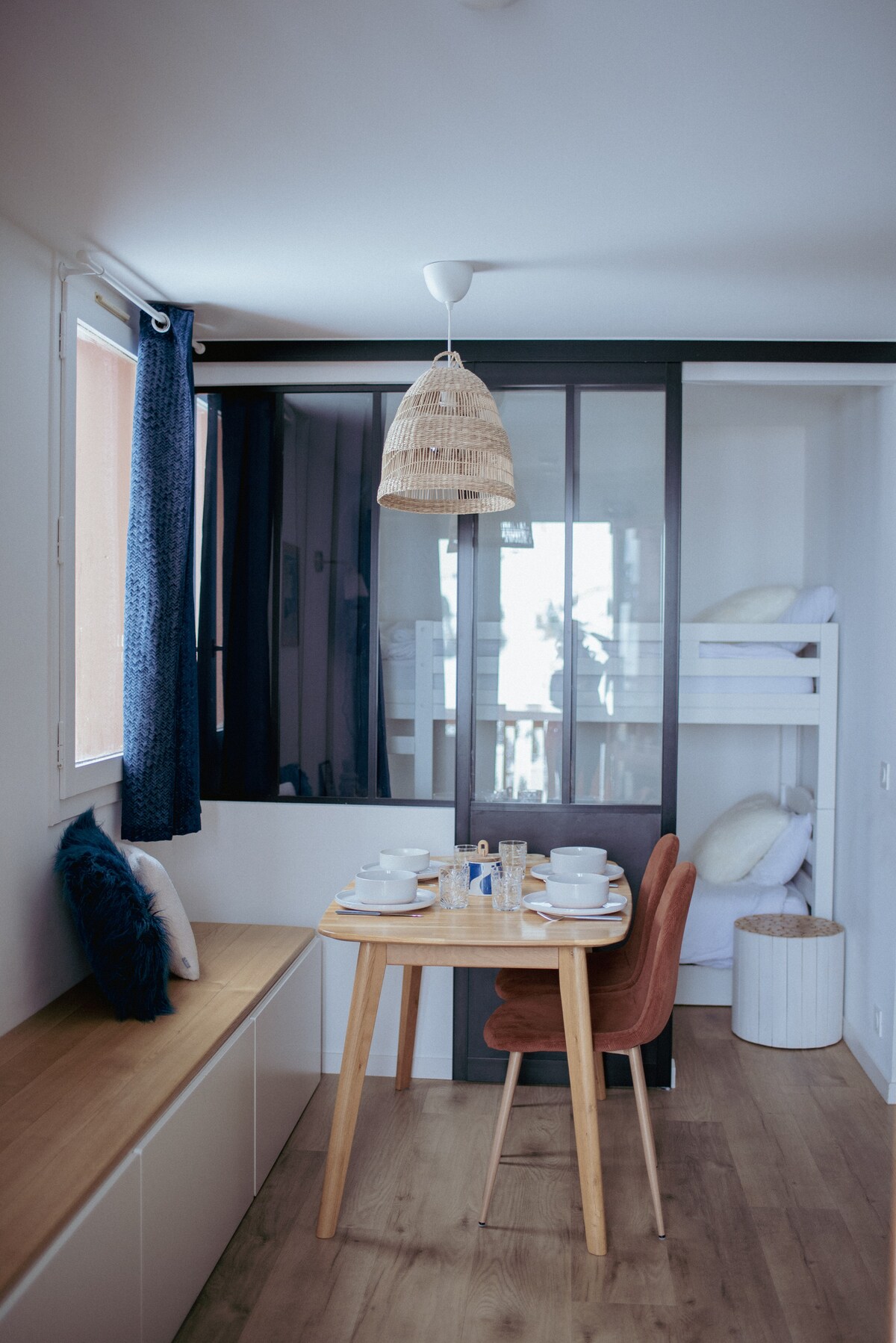 Ce logement paisible offre un séjour détente pour toute la famille. Equipé d'un lit gigogne d'un coté et d'un lit peigne de l'autre, cet appartement séparable par une cloison mobile est idéal pour 2 couples ou 2 parents avec 2 enfants. Une baignoire pour la fin de la journée de ski ou de randonnée. Un réfrigérateur avec congélateur pour pouvoir amener une partie de ses repas. Du confort ski au pieds. Location du Dimanche au dimanche pour la période d'hiver.