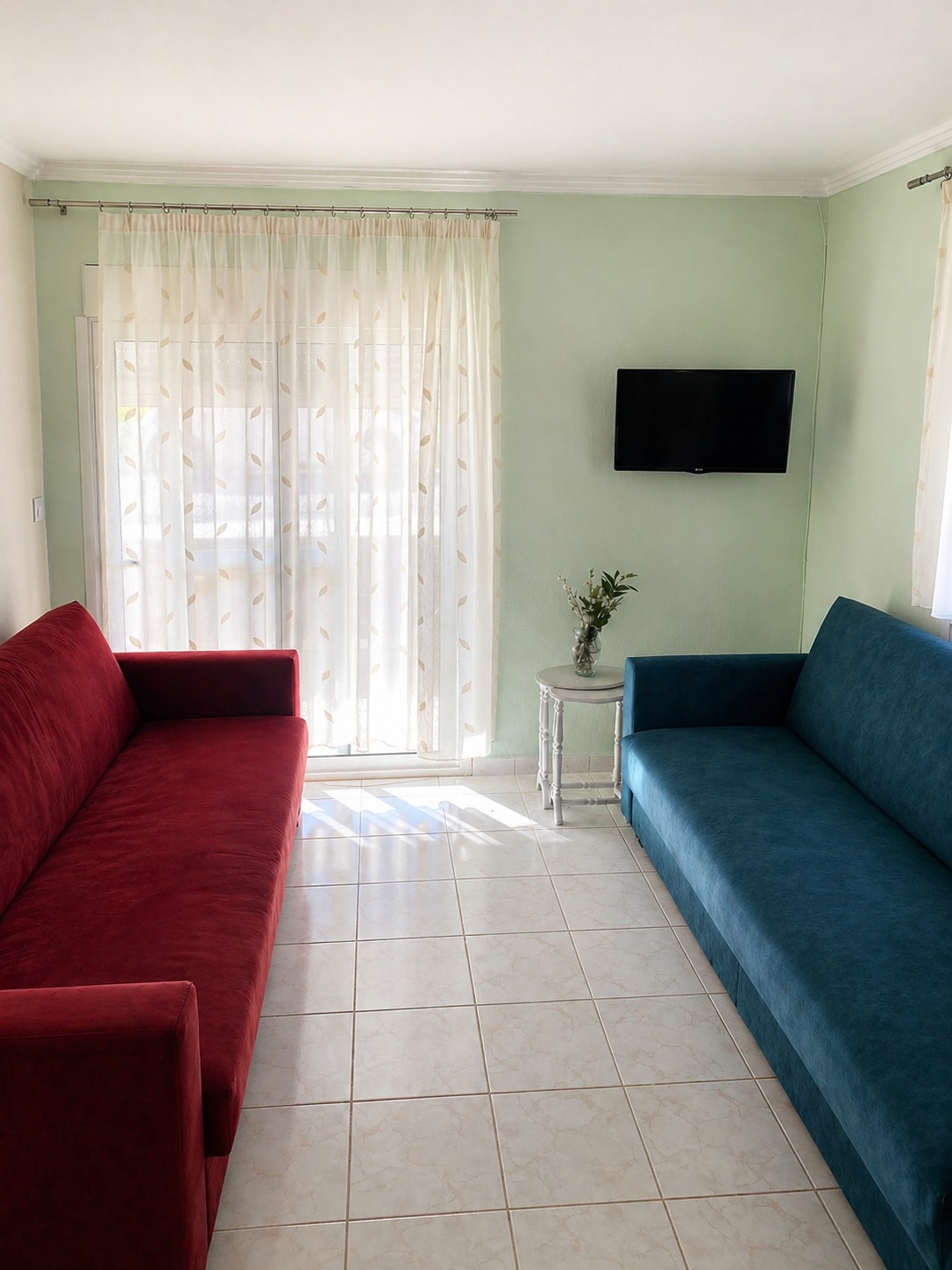 Nútímaleg og íburðarmikil íbúð í hjarta Leptokarya. Það samanstendur af 2 svefnherbergjum, stofu, eldhúsi, baðherbergi og 2 rúmgóðum svölum með útsýni yfir sjóinn og Olympus-fjall.