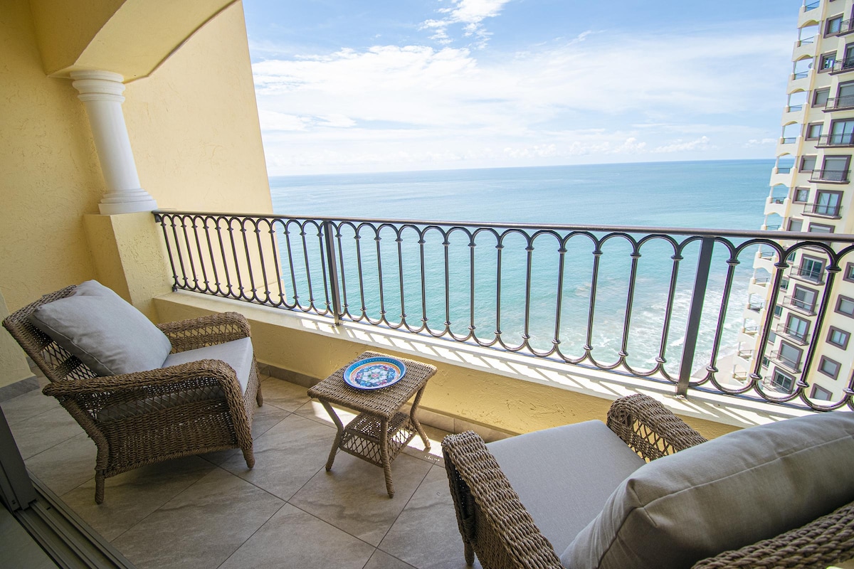 Kynnstu þessari lúxusíbúð á 19. hæð við ströndina með endalausu útsýni yfir Kyrrahafið á hinu virta Cerritos-svæði í Mazatlán. Þessi rúmgóða íbúð býður upp á 2 svítur með 1 king-rúmi og 2 hjónarúmum, 2,5 baðherbergi, W/D, A/C, sjónvarp, þráðlaust net, líkamsrækt, upphitaða sundlaug, heitan pott, fullbúið eldhús og margt fleira. Þessi lokaða samstæða heldur henni aðeins leyndri og afskekktri fyrir gesti. Njóttu hlaupastígsins sem leiðir þig að staðnum eða farðu í golf á tveimur af fallegustu golfvöllunum í aðeins nokkurra mínútna fjarlægð.