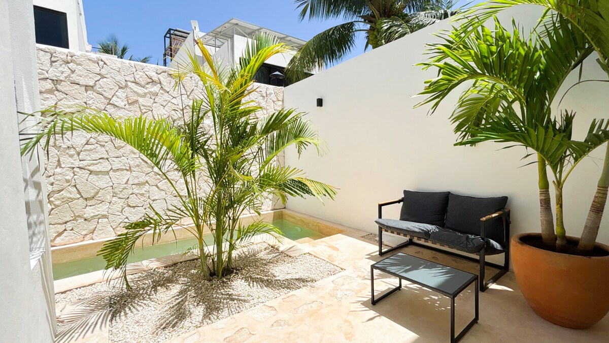 Este espacio cuenta con una amplia cama tamaño king y una atmósfera serena que invita al descanso. La propiedad incluye una alberca cubierta de uso exclusivo, brindándote privacidad y protección del sol, así como una hamaca para disfrutar momentos de relajación total. También podrás aprovechar la terraza privada cubierta, perfecta para cenas tranquilas, charlas nocturnas o disfrutar de unas copas al aire libre.