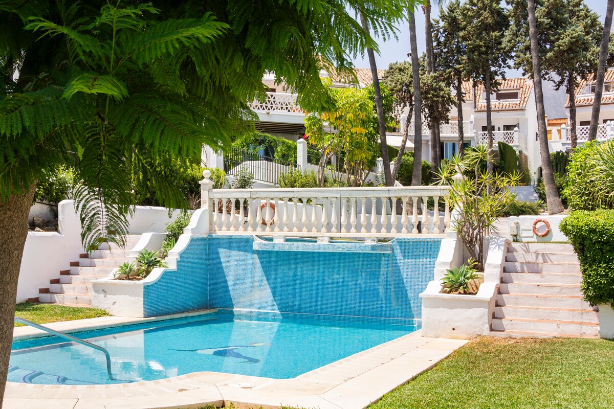 Rúmgóð og friðsæl íbúð á jarðhæð á frábærum stað við ströndina í San Pedro de Alcantara. Aðeins í 5 mínútna göngufjarlægð frá gylltum ströndum og breiðri gönguleið þar sem þú getur notið afslappandi gönguferða í átt að Puerto Banus. Tvö svefnherbergi og stór hornverönd með beinu aðgengi að sameiginlegum görðum og rólegu sundlaugarsvæði. Öll þægindi, stórmarkaður, magnaðir veitingastaðir, íþróttamiðstöð og bær San Pedro með nýja Boulevard í innan við 5-15 mínútna göngufjarlægð. Puerto Banus -3kms.