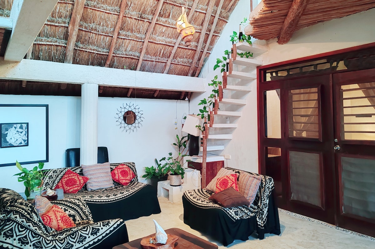 Escape to Palapa de la Selva, your eco-friendly hideaway in the lush jungle of Pueblo Sac-Be, just 10 minutes to Xcalacoco Beach and 15 minutes from the heart of Playa del Carmen. This one-of-a-kind solar-powered palapa offers the perfect balance of nature, privacy, and comfort. ✔️ Access to 3 tranquil cenotes ✔️ Wi-Fi, smart TV, private gated entry ✔️ Fully equipped off-grid kitchen ✔️ Personalized experiences (spa, chef, yoga, ceremonies) ✔️ Ideal for couples, nature lovers, and small groups